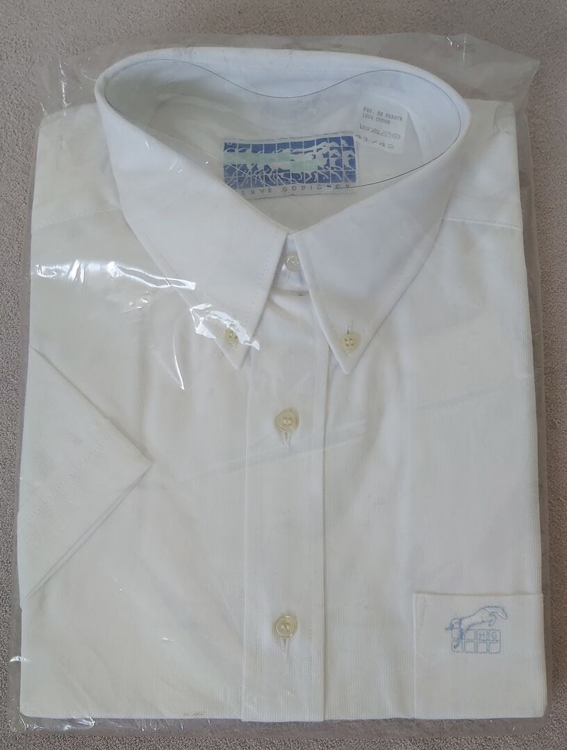 Koszula z krótkim rękawem od Herve Godignon - Sportowa koszulka jeździecka z krótkim rękawem wykonana z cienkiej bawełny w drobny wzór w paski, naszywana kieszeń z haftowanym logo z przodu i prosty dół. Kolor: biały/jasnoszary Rozmiar: 41/42