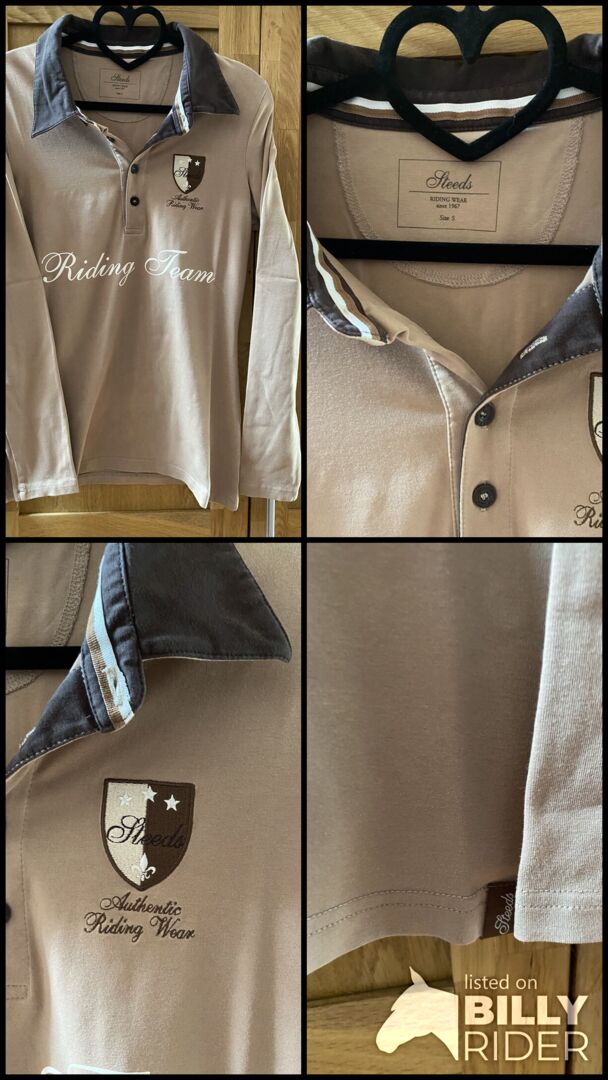 Koszulka polo z długim rękawem marki Steeds w rozmiarze S - Beżowa koszulka polo z długim rękawem Shrimp marki Steeds w rozmiarze S kołnierzyk niebieski, aplikacje brązowe, białe Jak nowe