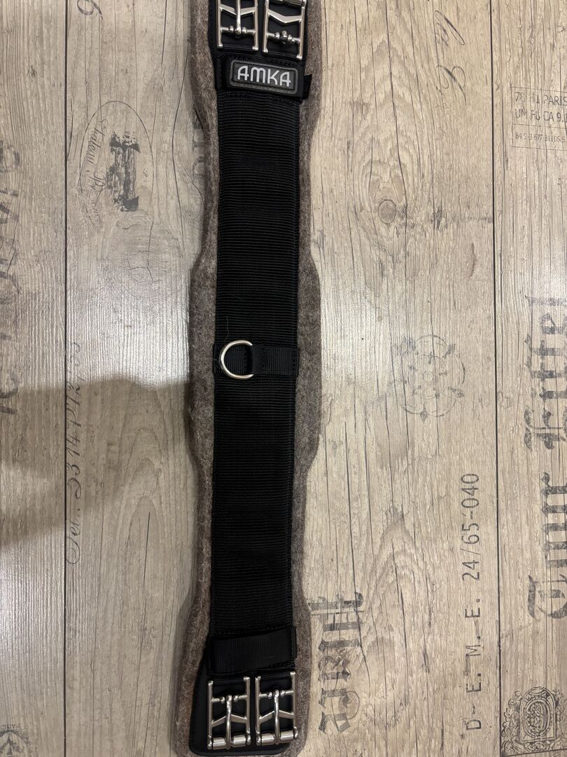 Krótki pasek filcowy Amka 60 cm - Krótki popręg AMKA ANATOMIC - popręg ujeżdżeniowy z filcowym podkładem do siodeł angielskich Wykonany z wysokiej jakości filcu wełnianego, materiał ma idealne właściwości pochłaniające nacisk i pot jako podkładka pod siodło. Anatomiczny krój zapewnia dobry komfort dla konia i zapobiega otarciom i punktom nacisku. Filc jest tradycyjnie stosowanym materiałem. Wyposażony w 4 sprzączki ze stali nierdzewnej z rolkami ułatwiającymi ponowne zakładanie, filc o grubości ok. 20 mm, 1 D-ring na pomocnicze lejce i wzmocniony nylonową taśmą o szerokości 7,5 cm.