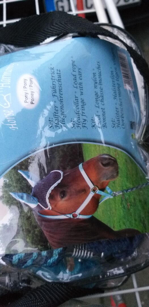 Kucyk w niebieskim zestawie z halterem, liną i maską na muchy - Oferuję nowy, nieużywany komplet w rozmiarze pony w kolorze niebieskim.