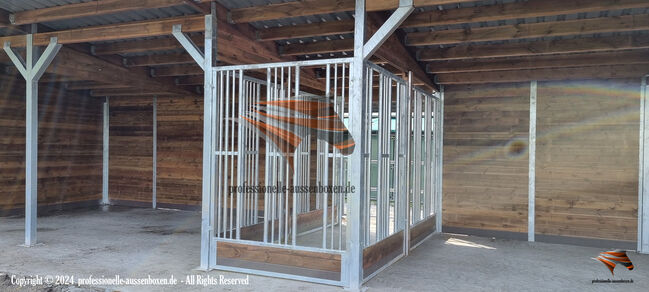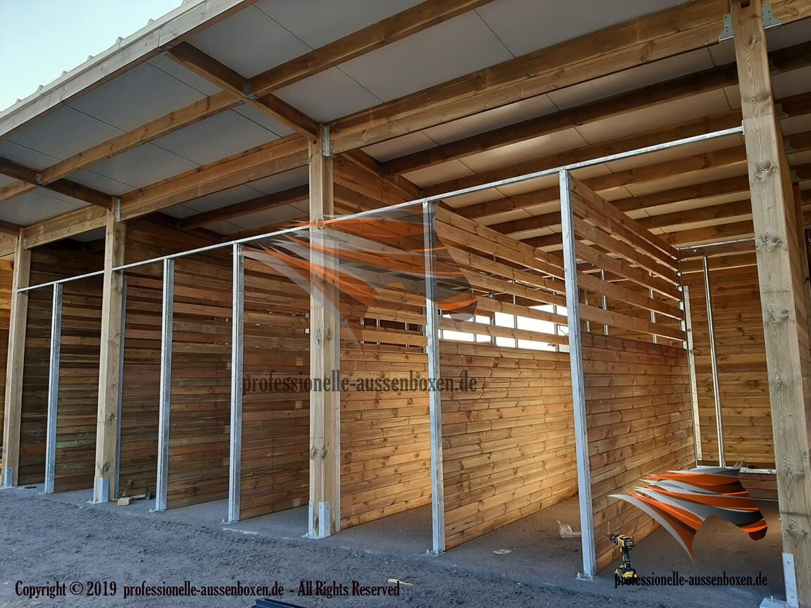 AUSSENBOXEN oferuje wysokiej jakości wiaty i zadaszenia dla koni, idealne na pastwiska, padoki i obszary karmienia.