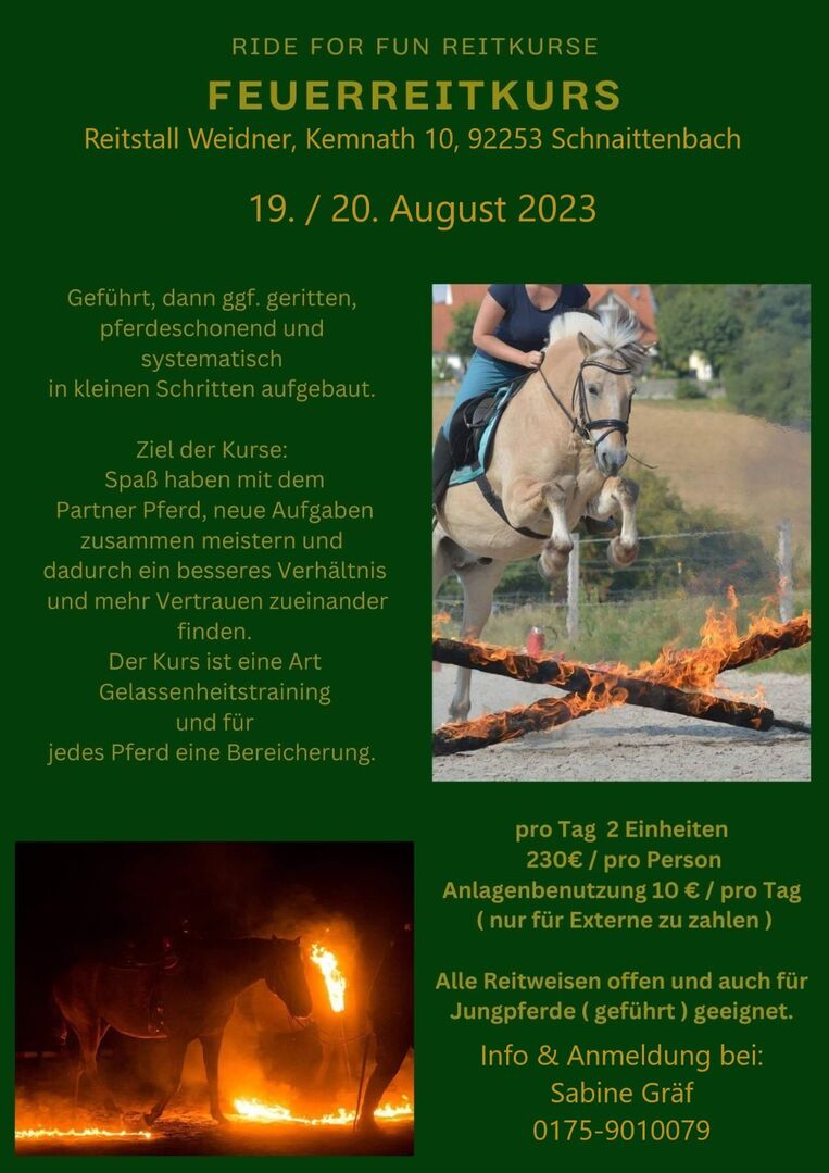 Kurs jazdy konnej Kemnath am Buchberg - Witam, Organizujemy w naszej stajni kurs ogniowy (jeździecki) w dniach 19 i 20 sierpnia, czyli już za 2 tygodnie. Są jeszcze wolne miejsca i jest on odpowiedni dla wszystkich typów koni. Kurs odbędzie się w Kemnath przy Buchberg 10, 92253 Schnaittenbach z wrażliwą trenerką Sabine Lauterbach. Pytania i rejestracja pod numerem 0175 9010079 u Sabine Gräf.
