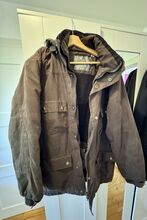 Kurtka jeździecka zimowa bardzo ciepła XXL unisex - Bardzo gruba kurtka z polarową podszewką i kapturem, który można odpiąć lub schować w zamku błyskawicznym. Guziki w pozycji siodła po obu stronach. Brak paska.