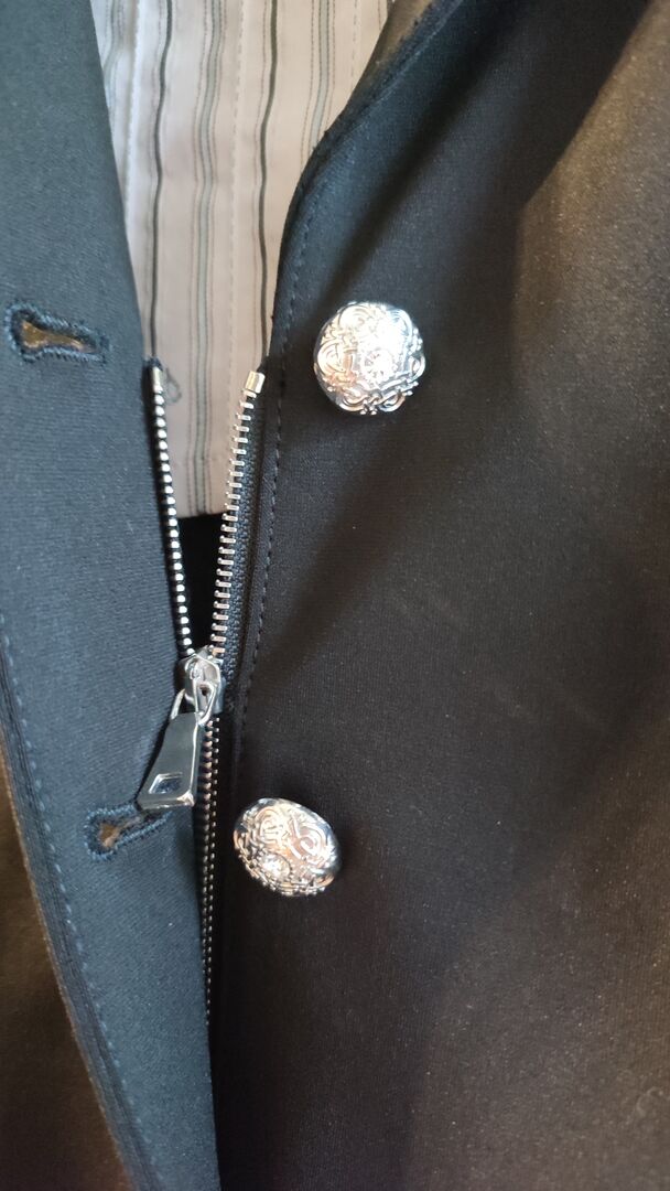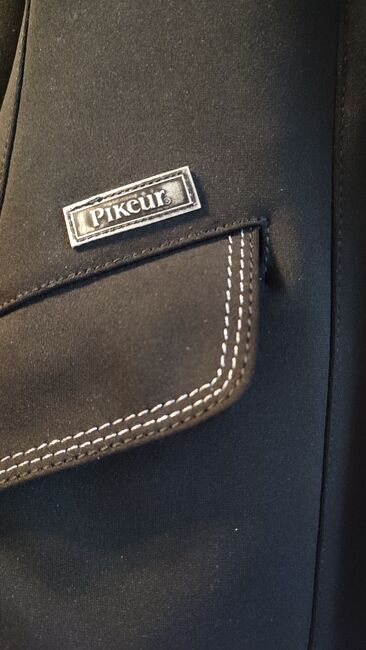 Kurtka Sarissa od Pikeur - Piękna kurtka pokazowa Pikeur "Sarissa" z dżerseju z zamkiem błyskawicznym, srebrną lamówką i guzikami z dżetów, rozmiar 40 Kurtka jest niezwykle wygodna w noszeniu i łatwa do prania. Zamek błyskawiczny oznacza mniejsze ryzyko odpadnięcia guzików, ponieważ są one w zasadzie tylko ozdobą. Kurtka była noszona przez jeden sezon i nie nosi śladów użytkowania