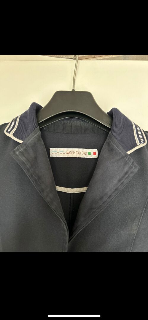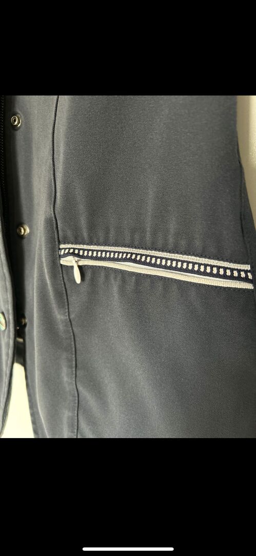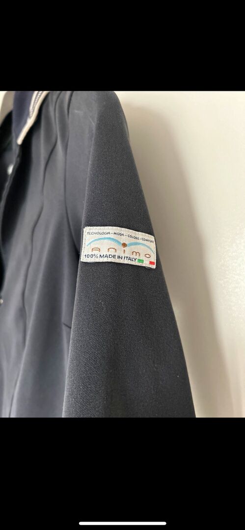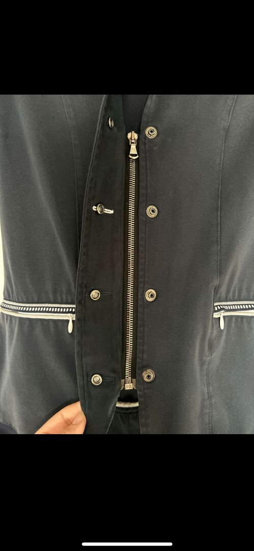 Kurtka turniejowa Animo 34 granatowa/niebieska z brokatowymi nitkami - Rzadko używana kurtka od Animo. Błyszczące detale na kołnierzu i kieszeniach. Wysokiej jakości wykonanie, bardzo łatwa w pielęgnacji i można ją prać w pralce. Zamki błyskawiczne na rękawach, idealne do zakładania rękawiczek jeździeckich. Zamek błyskawiczny i zatrzaski dla idealnego dopasowania! Kurtka jest bardzo przyjemna dla skóry.