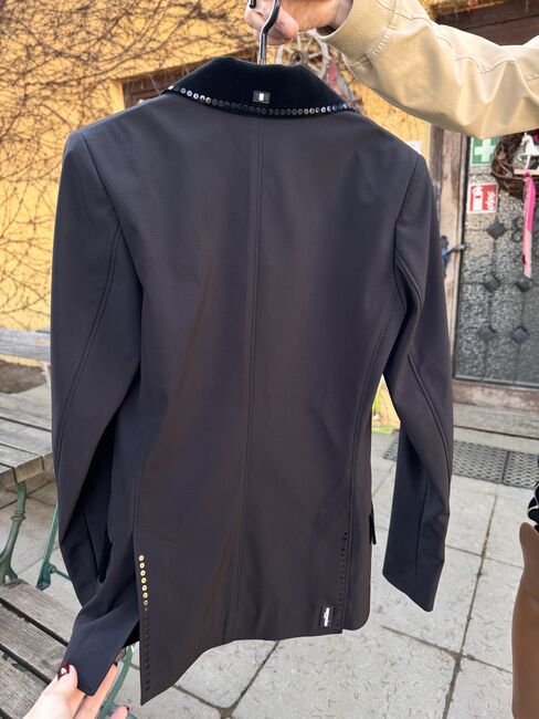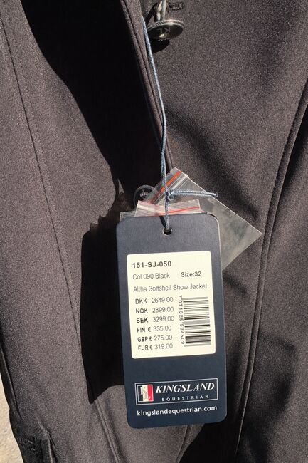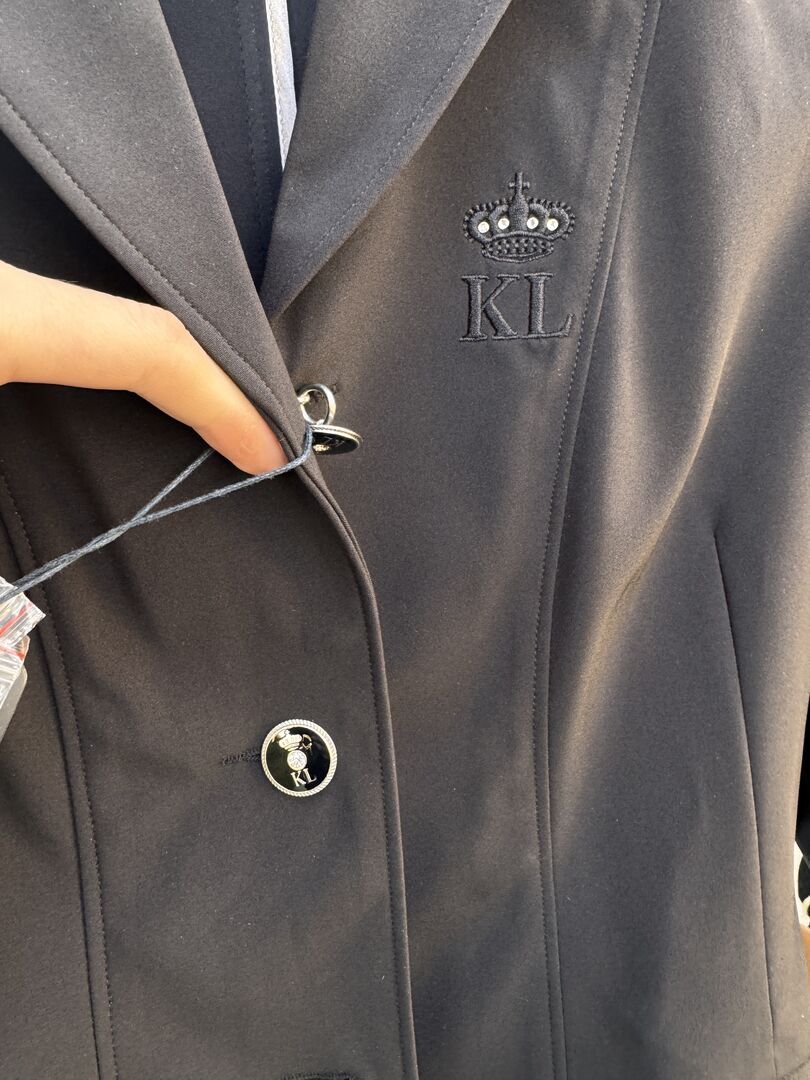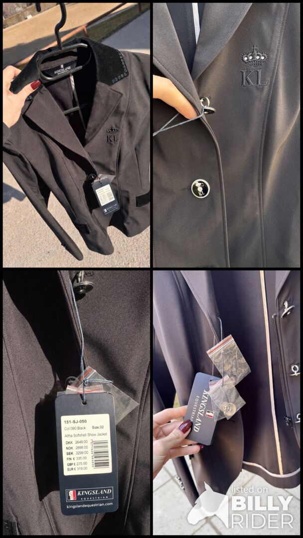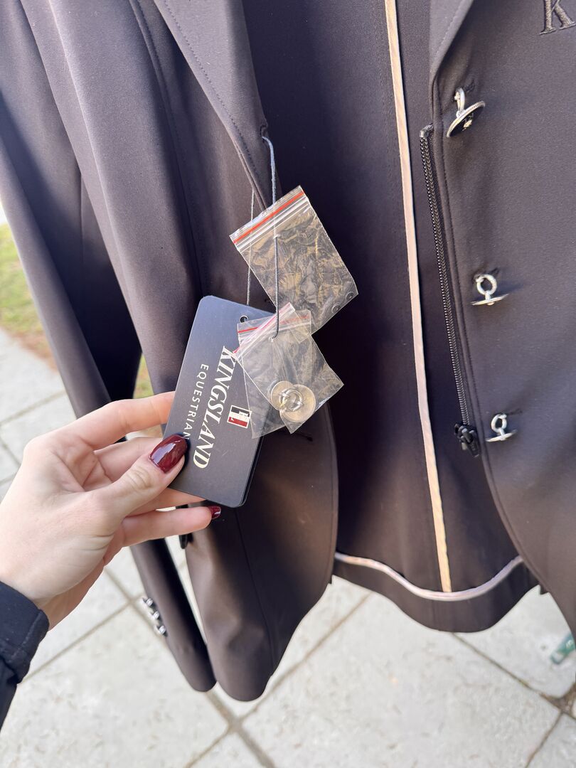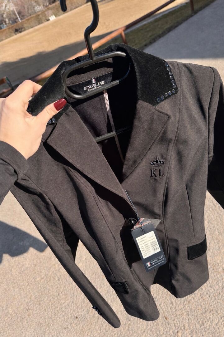 Kurtka turniejowa Kamizelka turniejowa Kingsland - Sprzedaję moją nienoszoną kurtkę pokazową od Kingsland Equestrian. Rozmiar 32/34 Nowa cena wynosiła wówczas 319,- €. Ma aksamitne elementy z bardzo cichymi cekinowymi detalami.... Moim zdaniem szykowna, ale niezbyt krzykliwa :) Cena VB