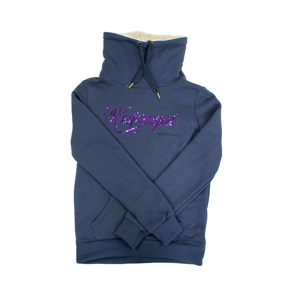 L-Pro West Sweter z wysokim kołnierzem navy XS - Ten świetny sweter marki L-Pro West jest idealnym towarzyszem na co dzień. Granatowy sweter ma miękko wyłożony wysoki kołnierz. Posiada dużą kieszeń na brzuchu i rozmiar XS. Posiada również duży cekinowy napis western girl z przodu. Skoczek posiada ślady zużycia. To the seller's offerlaunch