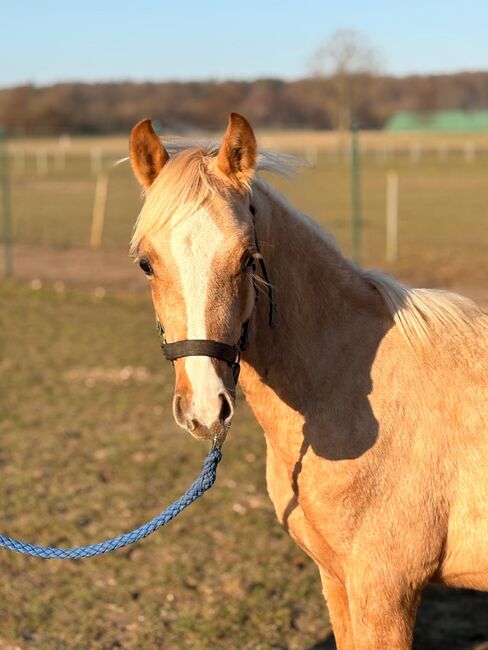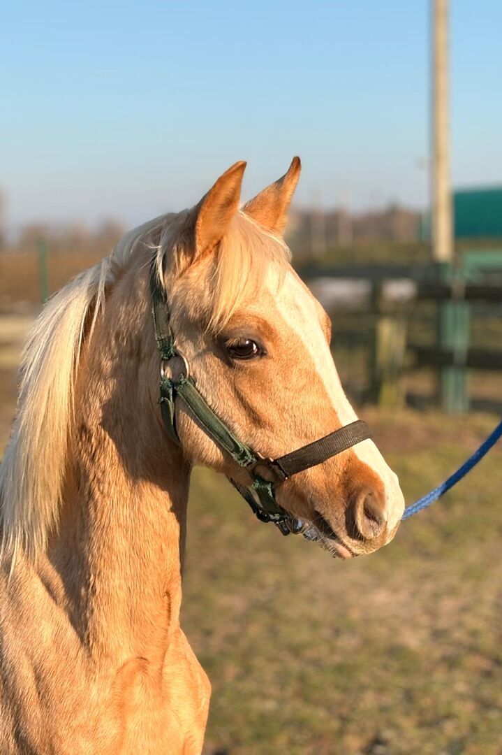 Piękny niemiecki ogier "Der Kleine Donner", urodzony 25.04.2025 r., zachwyca wspaniałym kolorem palomino i bardzo poprawną budową. Przy szacowanym ostatecznym wzroście ok. 145 cm przyciąga wzrok i imponuje swoim typem i charyzmą. Roczniak posiada papiery Verband der Pferdezüchter Mecklenburg-Vorpommern e.V. Mały Donner jest zdrowy, regularnie odrobaczany i szczepiony, zaczipowany i zna zarówno kowala, jak i weterynarza. Jest wyszkolony w halterze i zaznajomiony ze źrebięcym ABC. Dorastając w najlepszych warunkach w stadzie, jest zaznajomiony zarówno ze stajnią z codziennym wypasem, jak i pasterstwem. Jego charakter jest słodki, przyjazny i towarzyski, obecnie wciąż trochę nieśmiały, ale dobrze wychowany, uważny, bardzo chętny do nauki i zmotywowany. Ogier ma trzy bardzo dobre podstawowe chody i wysokiej jakości rodowód ukierunkowany na ujeżdżenie. Jego ojciec (Der Kleine Leonardo) jest licencjonowany i z powodzeniem wykorzystywany w ujeżdżeniu. Dzięki swoim wszechstronnym cechom Der Kleine Donner idealnie nadaje się jako przyszły koń konkursowy i rekreacyjny. Jest sprzedawany bezpośrednio przez hodowcę i szuka kochającego, wspierającego domu.