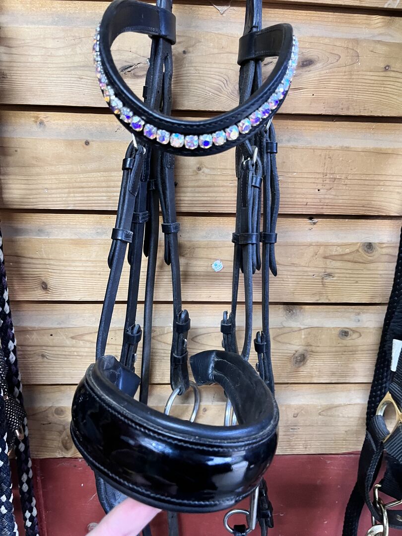 Lakierowany podwójny mostek czarny WB - Uzda jest bardzo wysokiej jakości i mało używana. Uzdę kupiłam prywatnie, niestety nie pasuje na mojego konia. nie pasuje do mojego konia. Opaska na brwi jest bardzo piękna, mieni się wszystkimi kolorami kolory tęczy. Patentowy nosek jest bardzo dobrze wyściełany, i został skrócony, bo był zbyt długi. Brakuje wytłoczenia marki z boku, ale według ostatniego sprzedawcy ma to być My Unicorn. Pod względem jakości i prezentacji wygląda jak wygląda, ale być może zastosowano inną opaskę na brwi. Niestety nie mogę stwierdzić z całą pewnością, że to właśnie ta marka. To właśnie ten pasek na brwi sprawia, że krawężnik jest w połączenie z lakierowanym noskiem. specjalny. Bez reniferów i bitów. Mogę jednak dodać pojedynczy bit od Sprengera w 13,5 cm i 14 mm. Sprzedaż prywatna bez możliwości zwrotu i gwarancji.