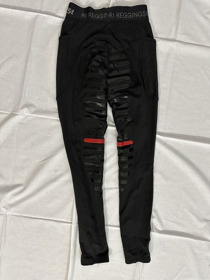 Legginsy jeździeckie czarne XS East - Jeździeckie legginsy East w kolorze czarnym z czerwonymi detalami w rozmiarze XS. Z silikonowym półsiedziskiem, kieszeniami na telefon komórkowy na obu nogawkach i taśmą antypoślizgową na kostkach. Noszone tylko kilka razy.