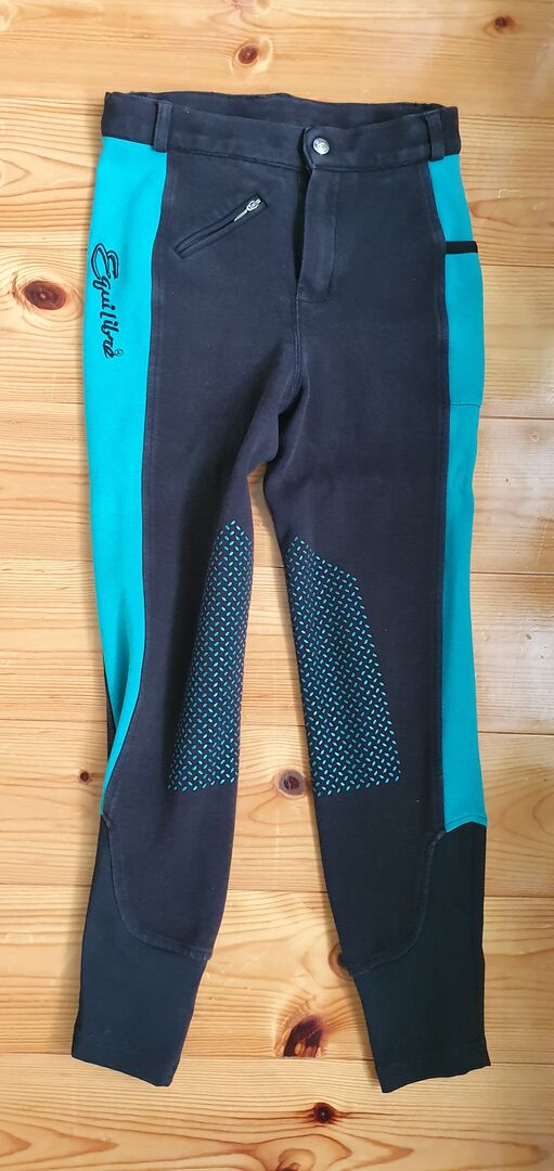 Legginsy jeździeckie Equilibre z nakolannikami rozmiar 152 - Sprzedajemy parę dobrze używanych dziecięcych legginsów jeździeckich w rozmiarze 152 od Equilibre w kolorze czarnym / turkusowym. Legginsy jeździeckie są w bardzo dobrym stanie i chętnie znajdą nowego właściciela. Możliwa wysyłka DHL lub odbiór osobisty w Berlinie