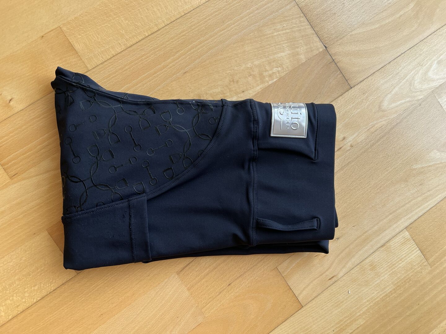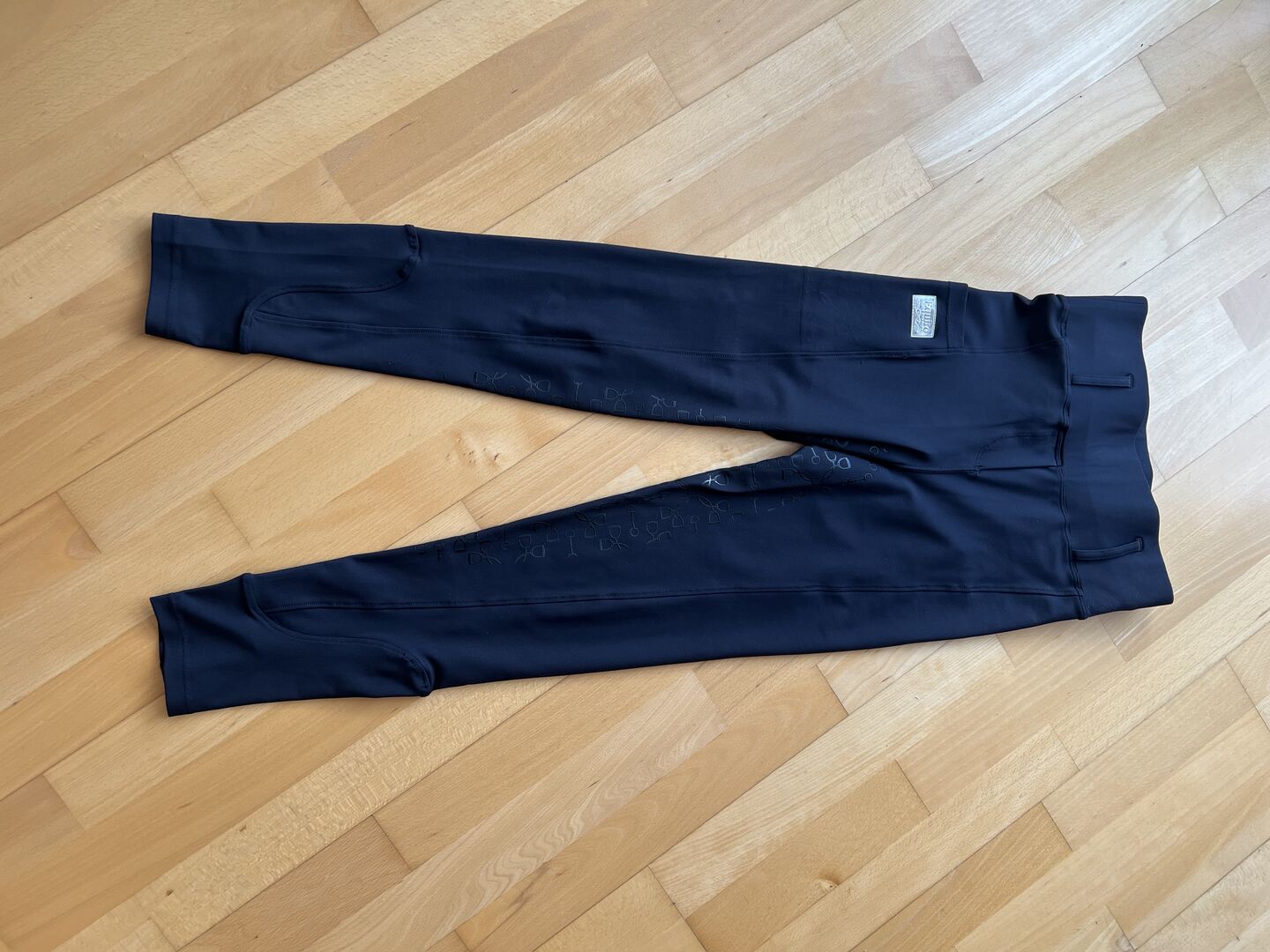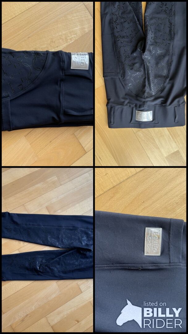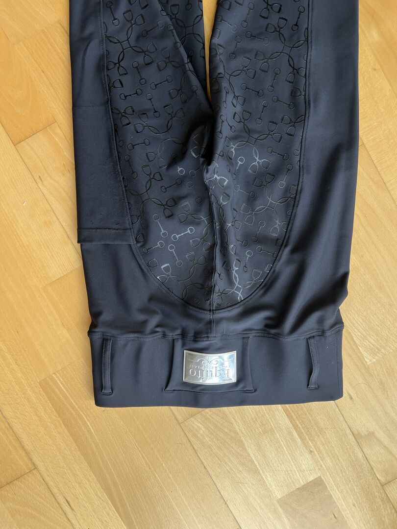 Sprzedam legginsy jeździeckie Full Grip marki Equito Equestrian w kolorze czarnym/srebrnym z kieszonką na telefon komórkowy na prawej nogawce i małymi srebrnymi detalami. Syntetyczny pełny uchwyt i elastyczny pas ze szlufkami.