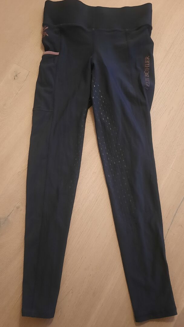 Legginsy jeździeckie Felix Bühler rozmiar 38 niebieskie - Sprzedaję te legginsy jeździeckie w kolorze niebieskim wykonane z poliamidu i elastanu z silikonowym wykończeniem, ponieważ moja córka zrezygnowała z jazdy konnej. Sprzedaję również dwa dodatkowe legginsy jeździeckie i parę bryczesów jeździeckich w pakiecie za 35 euro.
