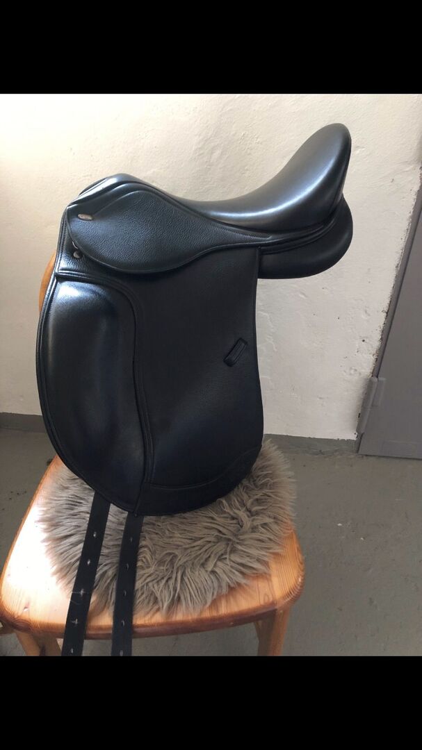 Letek Tekna Dressage Saddle Black 17" As Good As New - Prawie nowe! W zestawie znajdują się strzemiona, skóry do strzemion oraz pas (60cm). Płyta wpustowa może zostać wymieniona przez kolarza. Środkowy jest dopasowany.