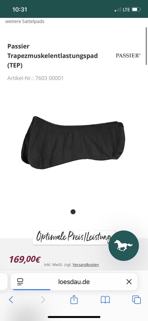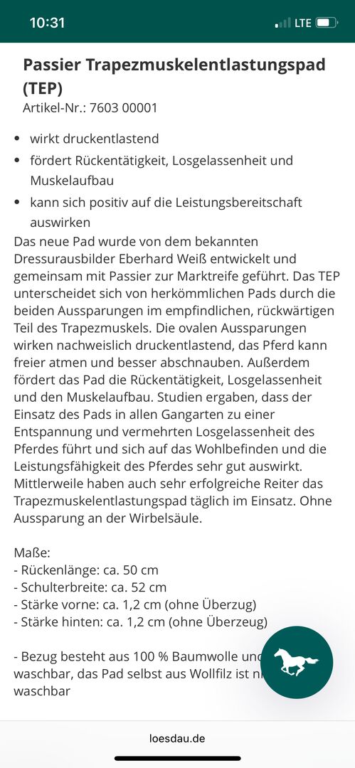 Opis: Podkładka odciążająca mięsień trapezowy Passier (TEP) Nr artykułu: 7603 00001 łagodzi nacisk promuje aktywność pleców, elastyczność i rozwój mięśni może mieć pozytywny wpływ na chęć do działania Nowa podkładka została opracowana przez znanego trenera ujeżdżenia Eberharda Weißa i wprowadzona na rynek wspólnie z firmą Passier. TEP różni się od konwencjonalnych ochraniaczy tym, że posiada dwa wycięcia we wrażliwej, tylnej części mięśnia czworobocznego. Owalne wgłębienia mają udowodnione działanie zmniejszające nacisk, pozwalając koniowi swobodniej oddychać i lepiej chrapać. Podkładka promuje również aktywność pleców, elastyczność i rozwój mięśni. Badania wykazały, że stosowanie podkładki we wszystkich chodach prowadzi do rozluźnienia i zwiększenia elastyczności konia oraz ma bardzo pozytywny wpływ na jego samopoczucie i wydajność. Odnoszący sukcesy jeźdźcy używają teraz również podkładki odciążającej mięśnie trapezowe na co dzień. Bez wgłębienia na kręgosłup.