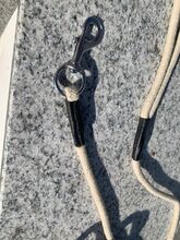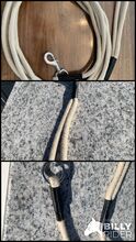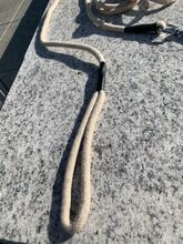 Lina do prac ziemnych bawełniana 5 m z pętlą ręczną i karabińczykiem - Lina do prac ziemnych z pętlą ręczną i karabińczykiem Mało używana, ma ok. 6 miesięcy Średnica liny 1,5 cm Kolor kremowy, czarna skóra Ślady użytkowania w postaci lekkich zabrudzeń (patrz zdjęcie) Sprzedaż prywatna bez gwarancji, wymiany, zwrotu