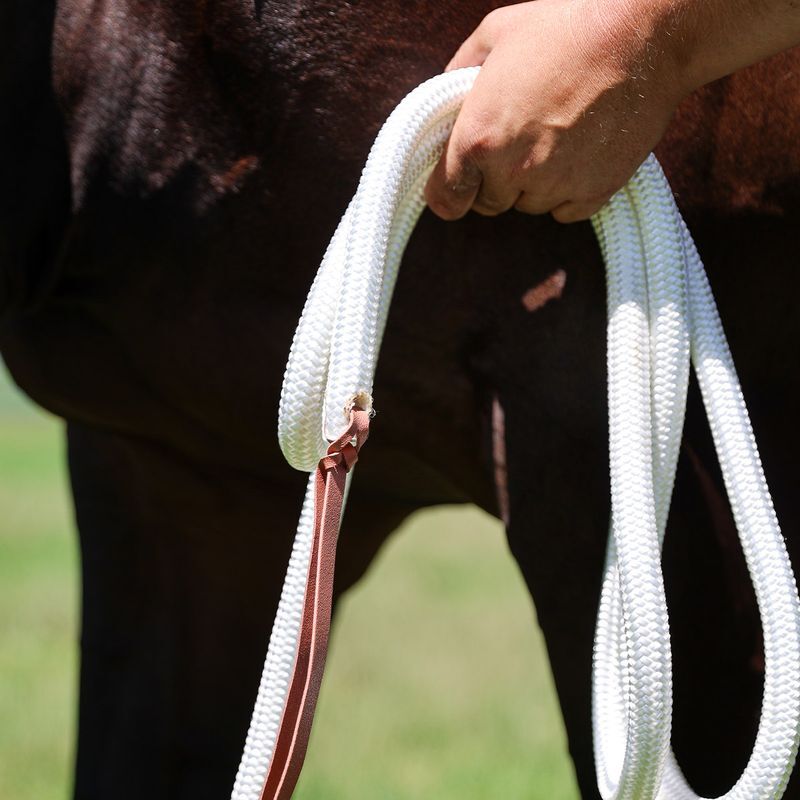 Najwyższej jakości materiał i wykonanie Wykonana z miękkiego, ale niezwykle wytrzymałego nylonu w kolorze jasnej bieli, lina zapewnia doskonałą przyczepność - bez nieprzyjemnego tarcia. Wytrzymały, niklowany karabińczyk Bull Snap zapewnia niezawodne i bezpieczne połączenie z kantarem, uzdą lub innymi akcesoriami. Klasyczna skórzana klapka na końcu chroni materiał przed strzępieniem i nadaje linie eleganckie wykończenie.