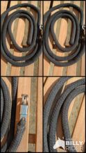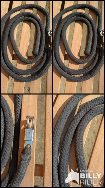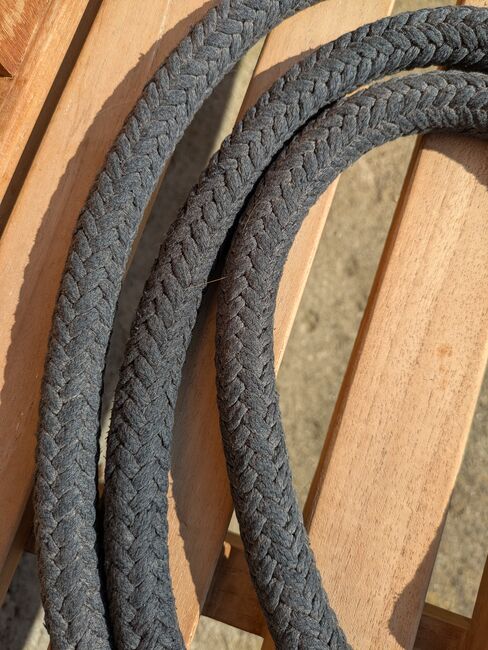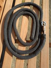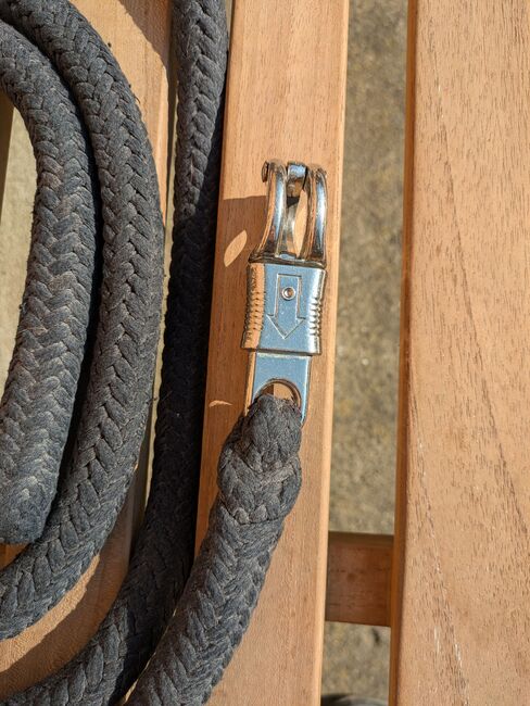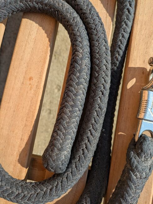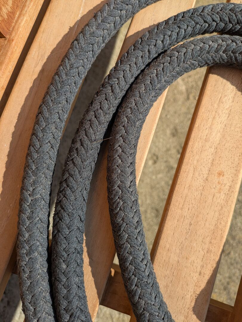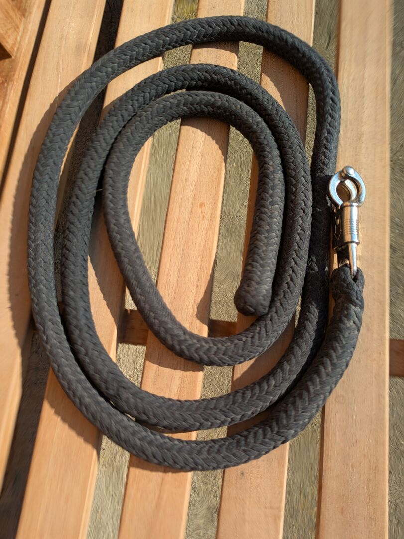 Lina do robót ziemnych - Lina do prac ziemnych z hakiem antypanicznym, czarna. Większa waga, długość ok. 220. Wyprana, obszary pomiędzy, które wydają się brązowe, wyblakły.