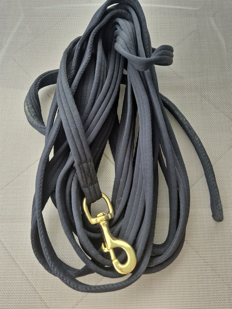 Long Line by Monty Roberts - prawie nowy - Bardzo dobra jakość, idealna do pracy naziemnej / lonżowania. Powinna mieć ok. 9 m długości. Prawie nieużywane - patrz zdjęcia. Przechowywany tylko w piwnicy.