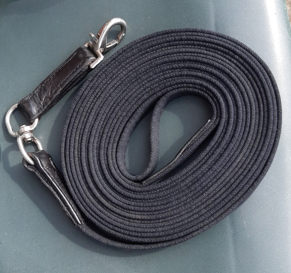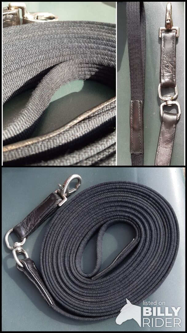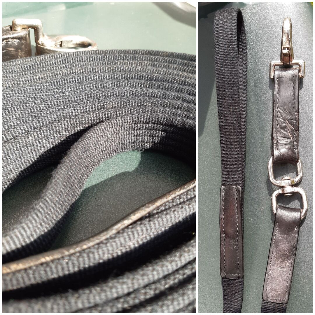Lonża z krętlikiem, czarna, ok. 8 m - Dobry stan z niewielkimi śladami zużycia.
