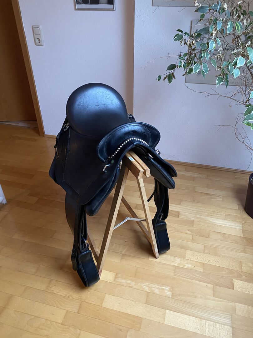 Zostało zamontowane na kłusującej klaczy i ma siedzisko 17,5 ". Zawsze jeździłam na nim w normalnych strzemionach.