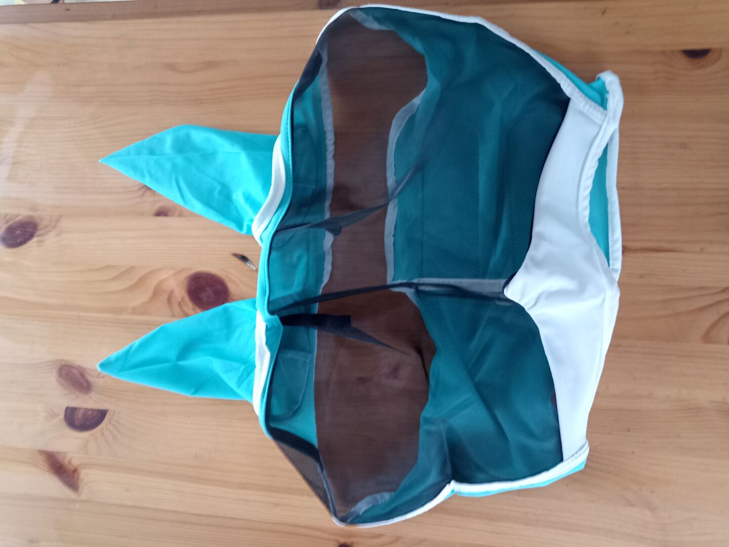 Maska na muchy - Na sprzedaż maska na muchy z podwójnym zapięciem na rzep w kolorze turkusowo-białym. Rozmiar M jest znacznie mniejszy. Mój koń jest między Cob i VB, ale maska jest bardziej odpowiednia dla małej głowy Cob lub kuca.
