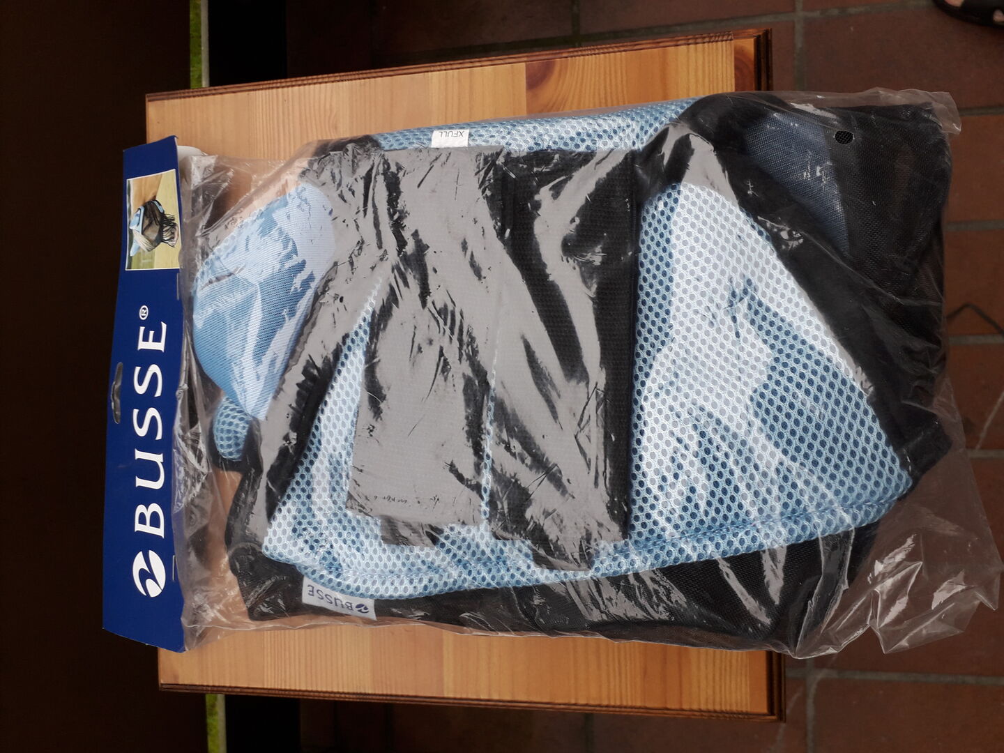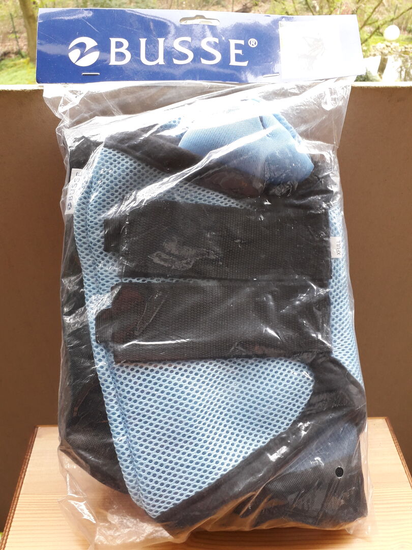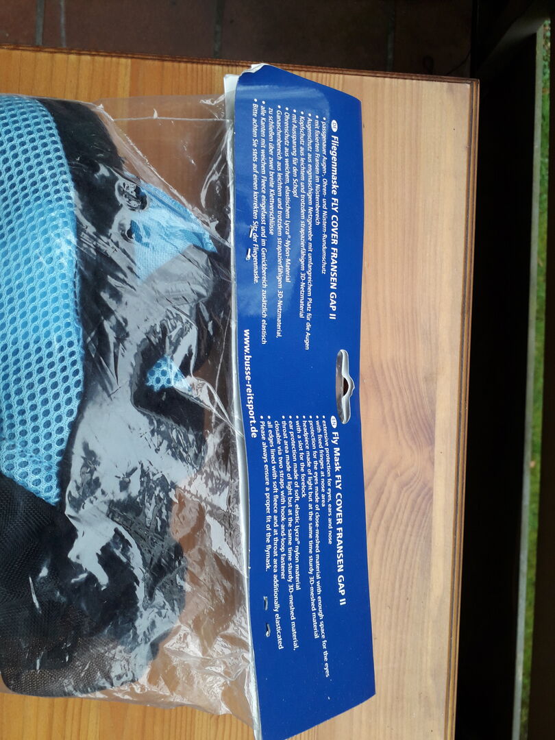 Maska na muchy Busse Fly Cover Fringes Gap II - Na sprzedaż maska na muchy Fly Cover z frędzlami firmy Busse. Kolor jasnoniebieski/czarny. Nowa i w oryginalnym opakowaniu. Maska wykonana jest z tkaniny siatkowej o gęstych oczkach z dużą ilością miejsca na oczy, ochrona uszu wykonana z miękkiego, elastycznego materiału nylonowego, ze stałymi frędzlami w okolicy nozdrzy. Wszystkie krawędzie obszyte są miękkim polarem. Zapinana na dwa szerokie rzepy od spodu. Z otworem na mop z sierści. Rozmiar: XWB (warmblood, bardzo duży) Sprzedaż prywatna, bez zwrotów i gwarancji. Możliwa wysyłka, koszty ponosi kupujący Płatność przelewem bankowym lub Paypal