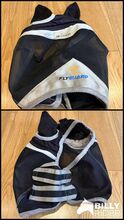 Maska przeciw muchom dla konia - czarno-szara - dobry stan - Maska na muchy dla koni (seria Pro Fly Guard) w dobrym stanie. Oddychająca siatka z ochroną uszu i bezpiecznymi paskami. Czysta i w pełni funkcjonalna, z normalnymi śladami użytkowania.