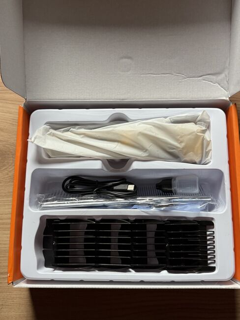 Akcesoria: 5 nasadek (1,5 mm, 3 mm, 6 mm, 9 mm i 12 mm), grzebień ze stali nierdzewnej, nożyczki ze stali nierdzewnej, szczotka do czyszczenia i mała butelka oleju.