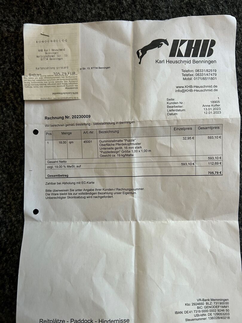 Mata pudełkowa "Puzzle" 1x1 metr kwadratowy, 16 metrów kwadratowych używanych na sprzedaż - Obecnie sprzedaję moje gumowe maty do straganu, mój stragan ma nieco ponad 16 m2. Maty kupiłem w styczniu 2023 roku, kosztowały kosztowały 705,79 € nowe. Maty znajdują się obecnie w mojej stajni pensjonatowej w Scheuring niedaleko Landsberg am Lech i można je odebrać w dowolnym momencie. Są to gumowe maty "Puzzle", wzór głowy konia na powierzchni, spód rowkowany, grubość 16 mm, wzór puzzli, 1x1 m, waga ok. 19 kg/mata. Przeprowadzam się i nie potrzebuję żadnych mat w nowej stajni.