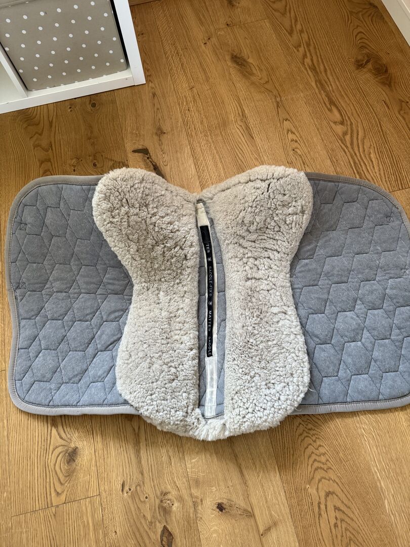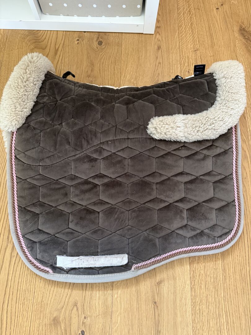 Matowa podkładka pod siodło ujeżdżeniowe - Na sprzedaż piękna podkładka pod siodło Mattes DR w kolorze brązowym z różowym/brązowym sznurkiem i systemem mocowania siodła. W bardzo dobrym stanie, futro jest nadal bardzo ładne i puszyste.