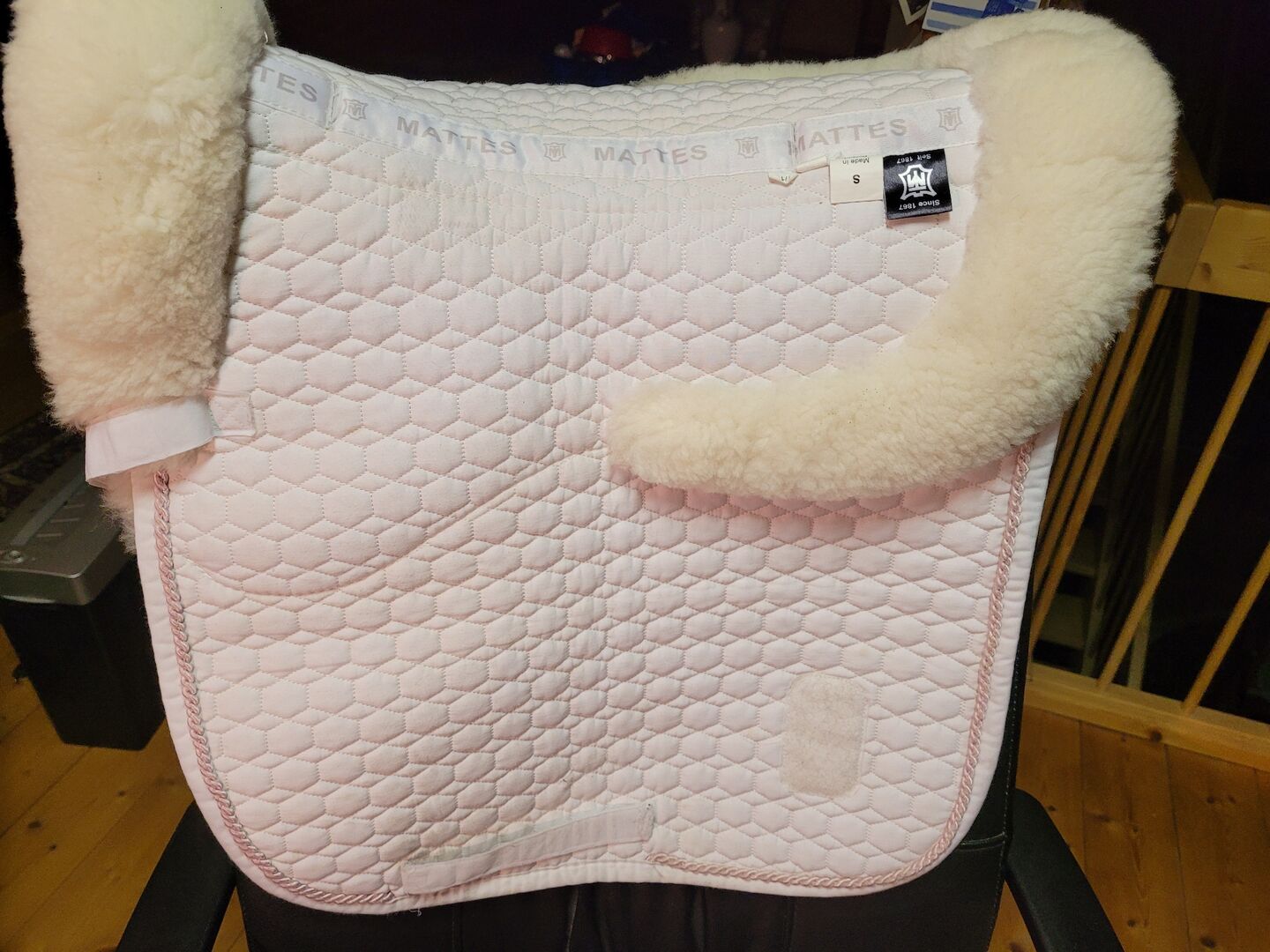 Mattes Podkładka pod siodło ujeżdżeniowe biała Rozmiar S Kucyk - Mało używany pad pod siodło ujeżdżeniowe w kolorze białym, był używany tylko kilka razy na zawodach. Przód i tył siodła z obramowaniem ze skóry jagnięcej, jak również w obszarze siodła Dyskretna różowa lamówka