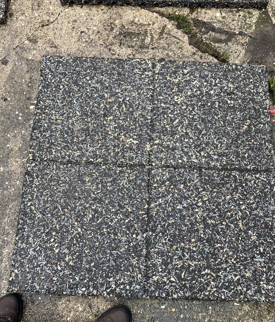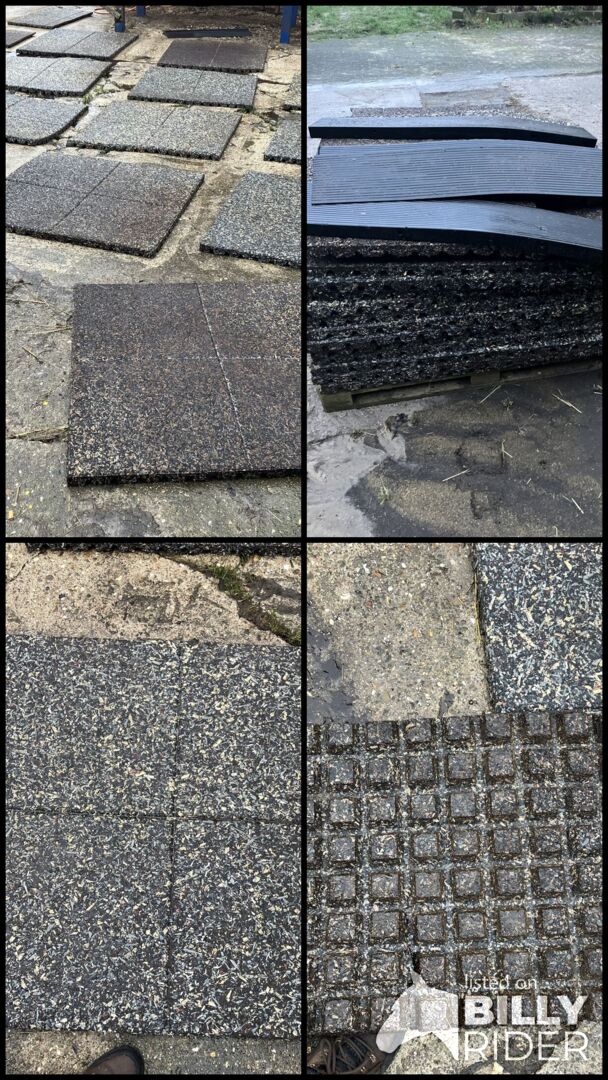Maty gumowe 12m kw. do stajni lub na padok - Oferuję 12 mat gumowych 1x1 m do stajni lub na padok. Maty mają grubość ok. 4 cm i przepuszczają wodę. Dzięki niższej strukturze ciecz spływa. Zdjęcie S. Maty są użytkowane od 2 lat. Sprzedawane są z 4 m rampą gumową do zabezpieczenia krawędzi oraz kilkoma resztkami ok.50x50cm. Każda mata waży ok. 30 kg. Sprzedawane prywatnie do samodzielnego odbioru.