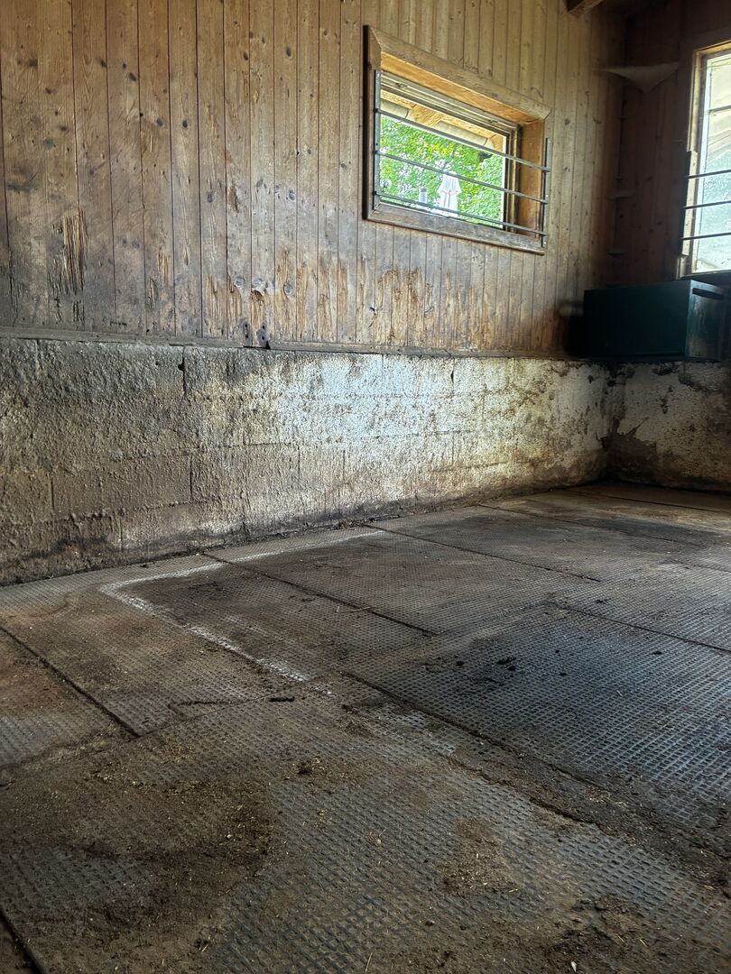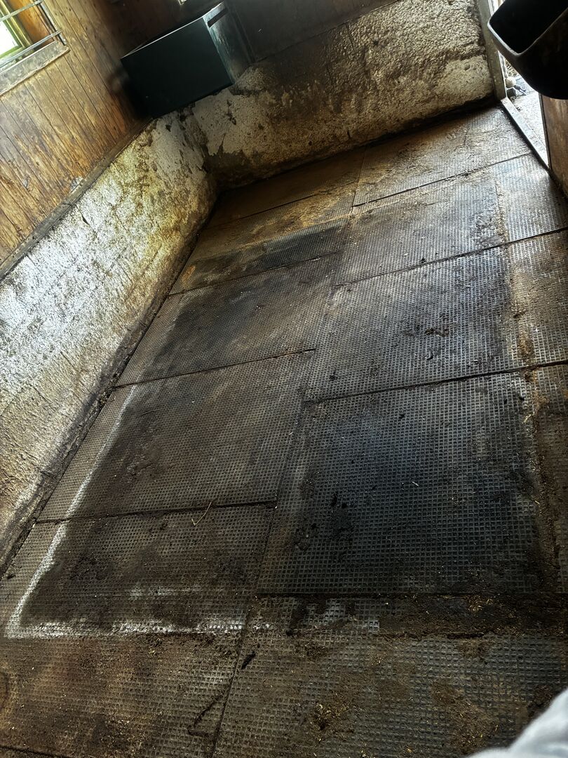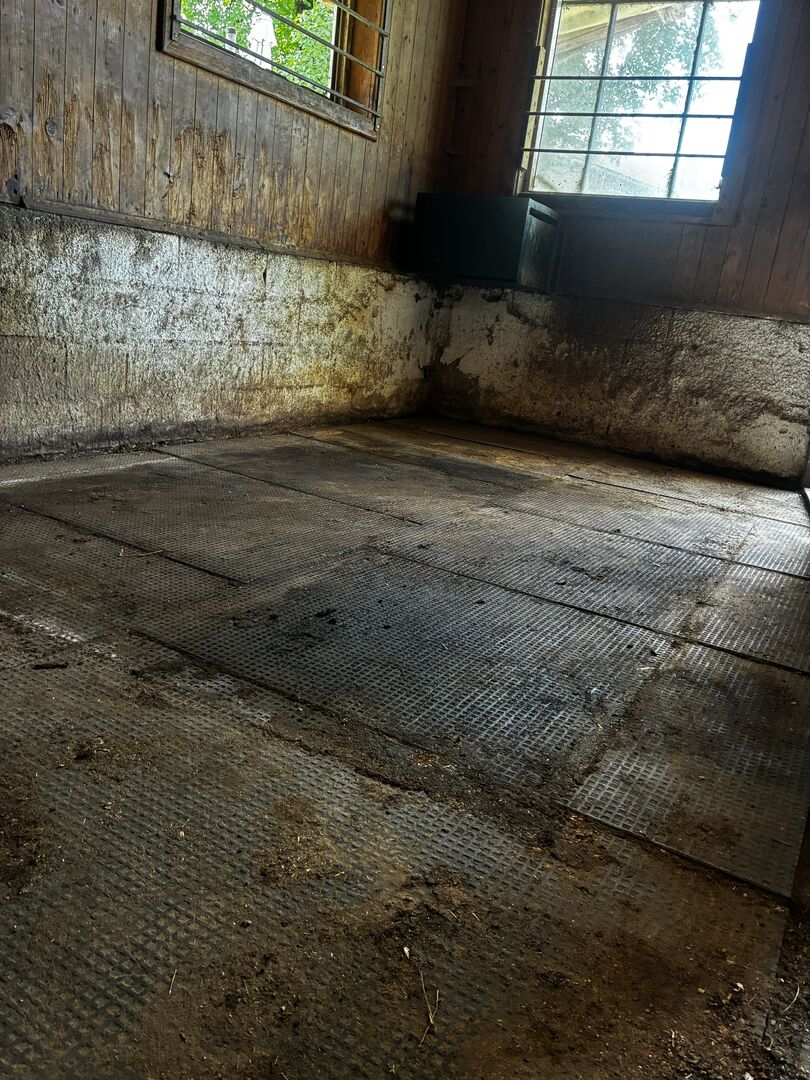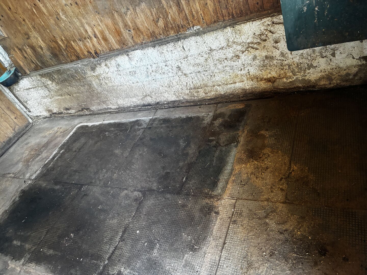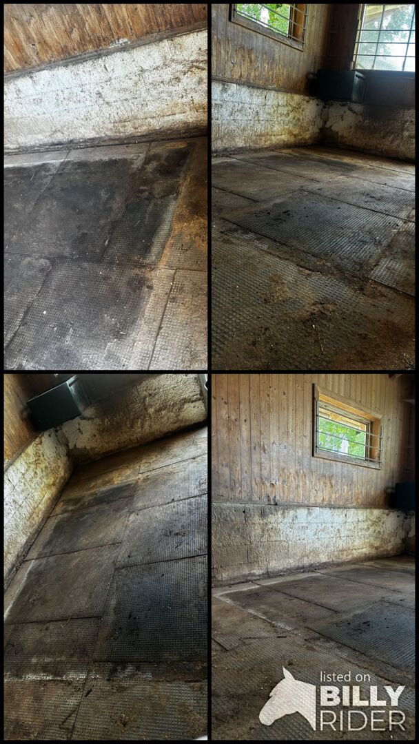 Maty podkładowe - Z powodu śmierci mojego konia wystawiam na sprzedaż moje maty stajenne. Maty mają teraz ok. 3,5 roku i są w dobrym stanie (tylko brudne). Dzięki systemowi pióro-wpust są bardzo łatwe do układania i bardzo łatwe do cięcia za pomocą wyrzynarki. Maty zapewniają dobrą izolację, dzięki czemu podłoga nie marznie. Pudełko ma wymiary około 4,5 x 3 metry. Gruby materiał wykonany z przetworzonego PVC i spód z profilem poduszki powietrznej zapewniają koniowi duży komfort i chronią przed promieniującym zimnem.