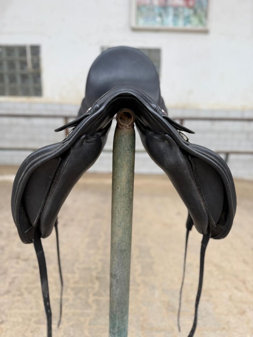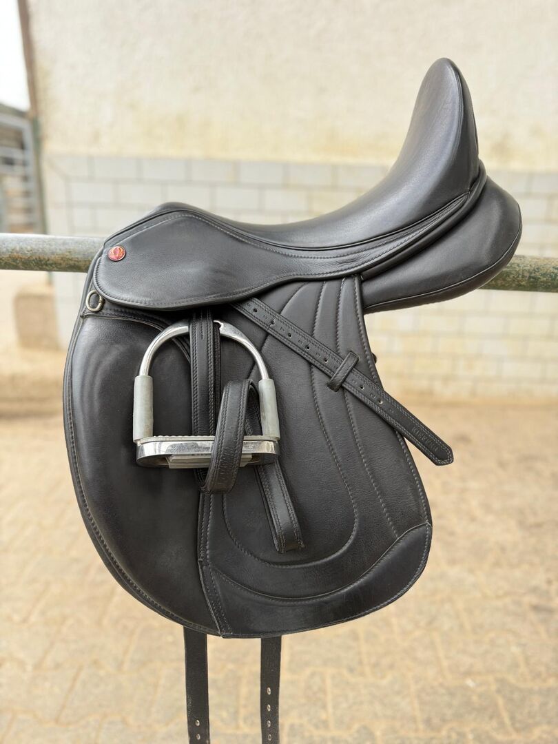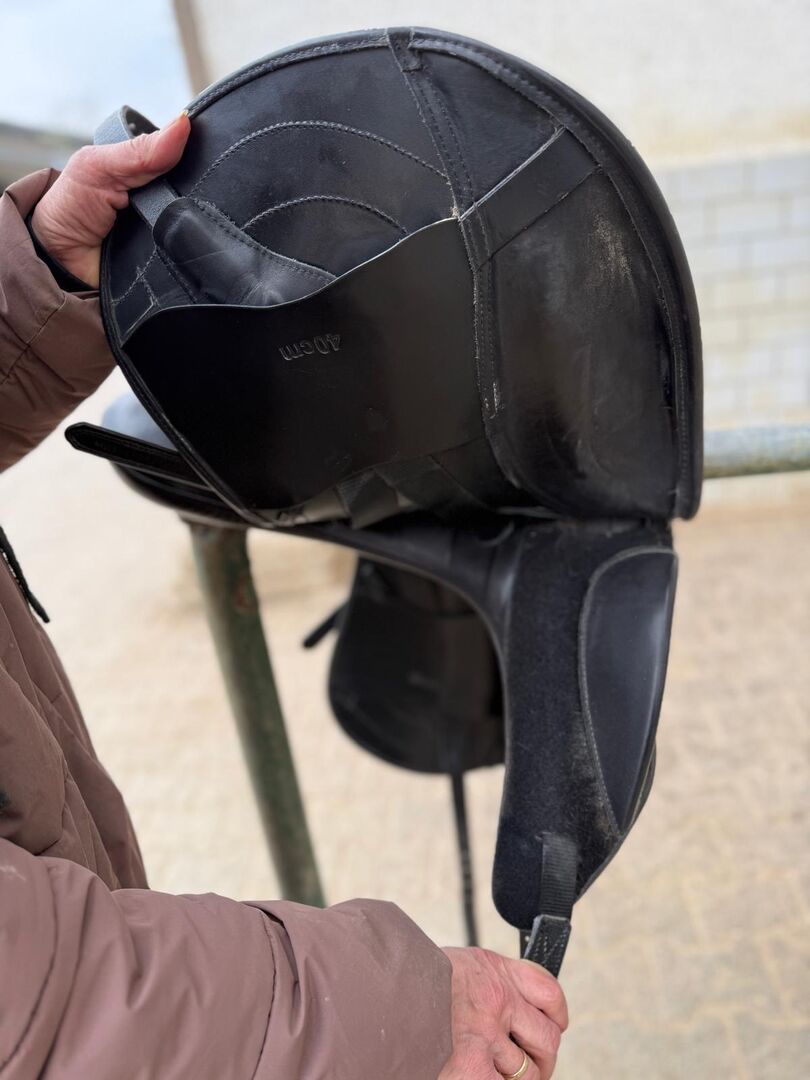 Max Benz One siodło ujeżdżeniowe z klapą mono - Siodło zostało kupione w 2020 roku za 2500 euro W 2022 roku wymieniliśmy siodło na to, ponieważ skóra miała defekt. Więc nowe od roku 2022 Siedzisko ma 40 lat Dlatego siodło ma tylko 2,5 roku Siodło było bardzo rzadko używane, ponieważ koń był starszy i mało jeżdżony. Siodło wygląda na bardzo nowe Siodło ma klapę mono Wałki kolanowe są zapinane na rzep lub odpinane na rzep. W zależności od tego, czy potrzebny jest popręg Dostępne są 4 łęki Dlatego nadaje się dla prawie każdego konia