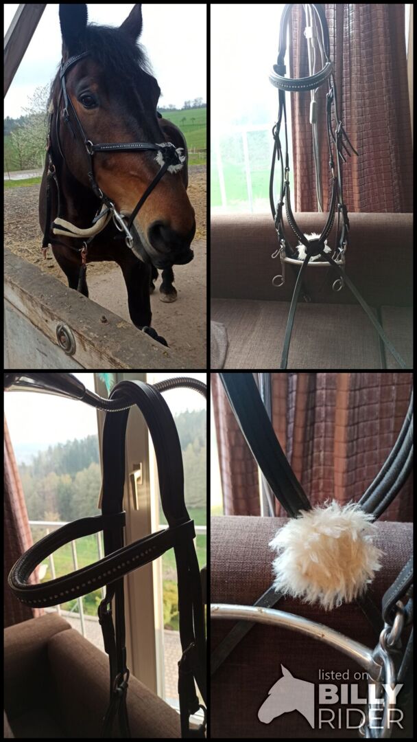 Meksykański Caveson Snaffle Rhinestone Coldblood XFull jak nowy - Oferuję czarny skórzany snaffle z dżetami na browbandzie i nosebandzie dla dużych głów bez bitu. Był tylko raz na koniu do przymiarki, niestety nie pasuje idealnie. Pasek na szyi jest miękko wyściełany, a na nosie jest biały plusz.