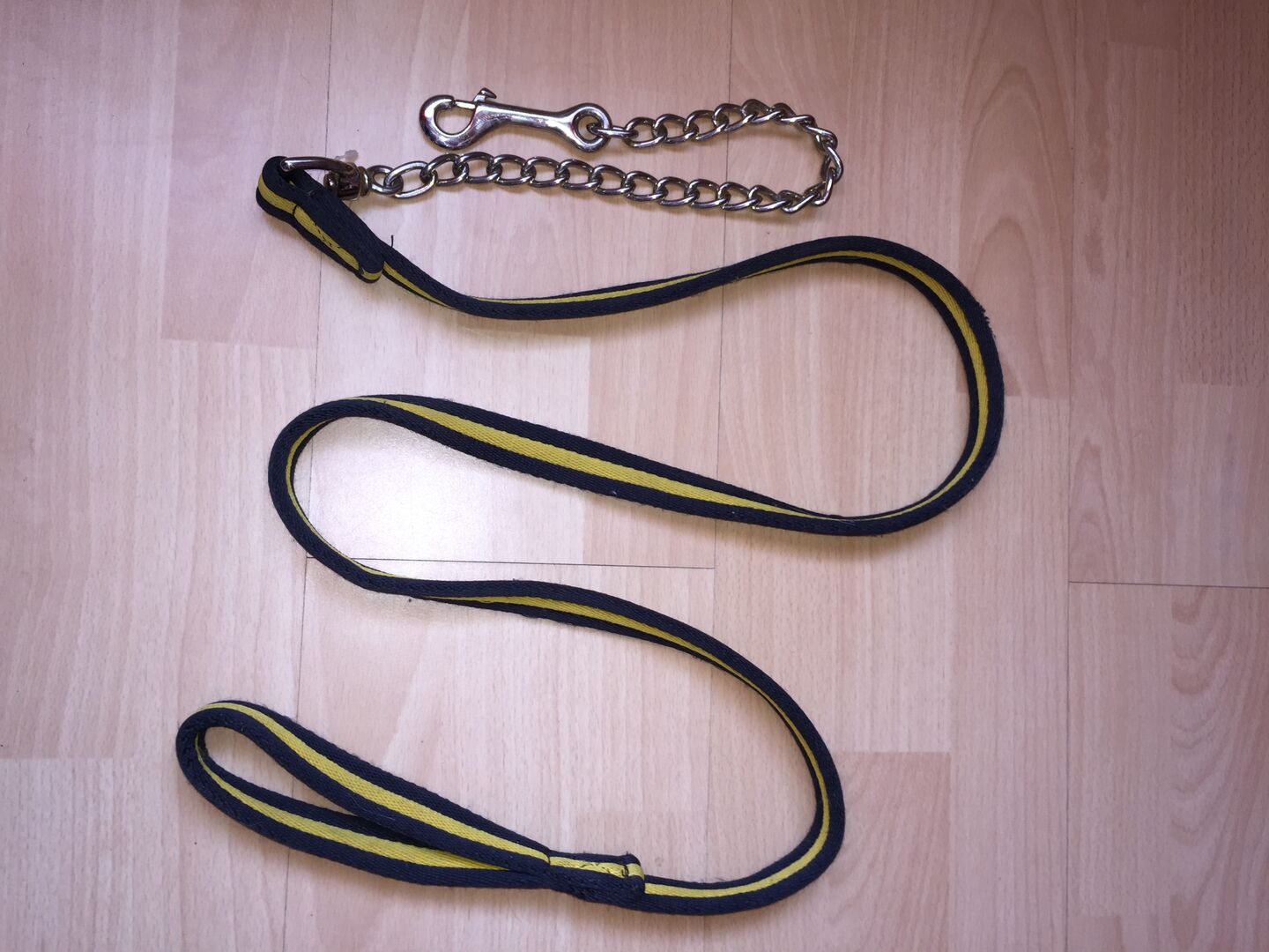 Miękki łańcuch prowadzący - Kolor: ciemnoniebiesko-żółty Części metalowe w kolorze srebrnym Producent: Kalvalkade? - ołowiana linka z łańcuszkiem srebrnym - z karabińczykiem Kolor: czarny/żółty Łączniki: srebrne używałem go przez krótki czas, dopóki nie miałem liny