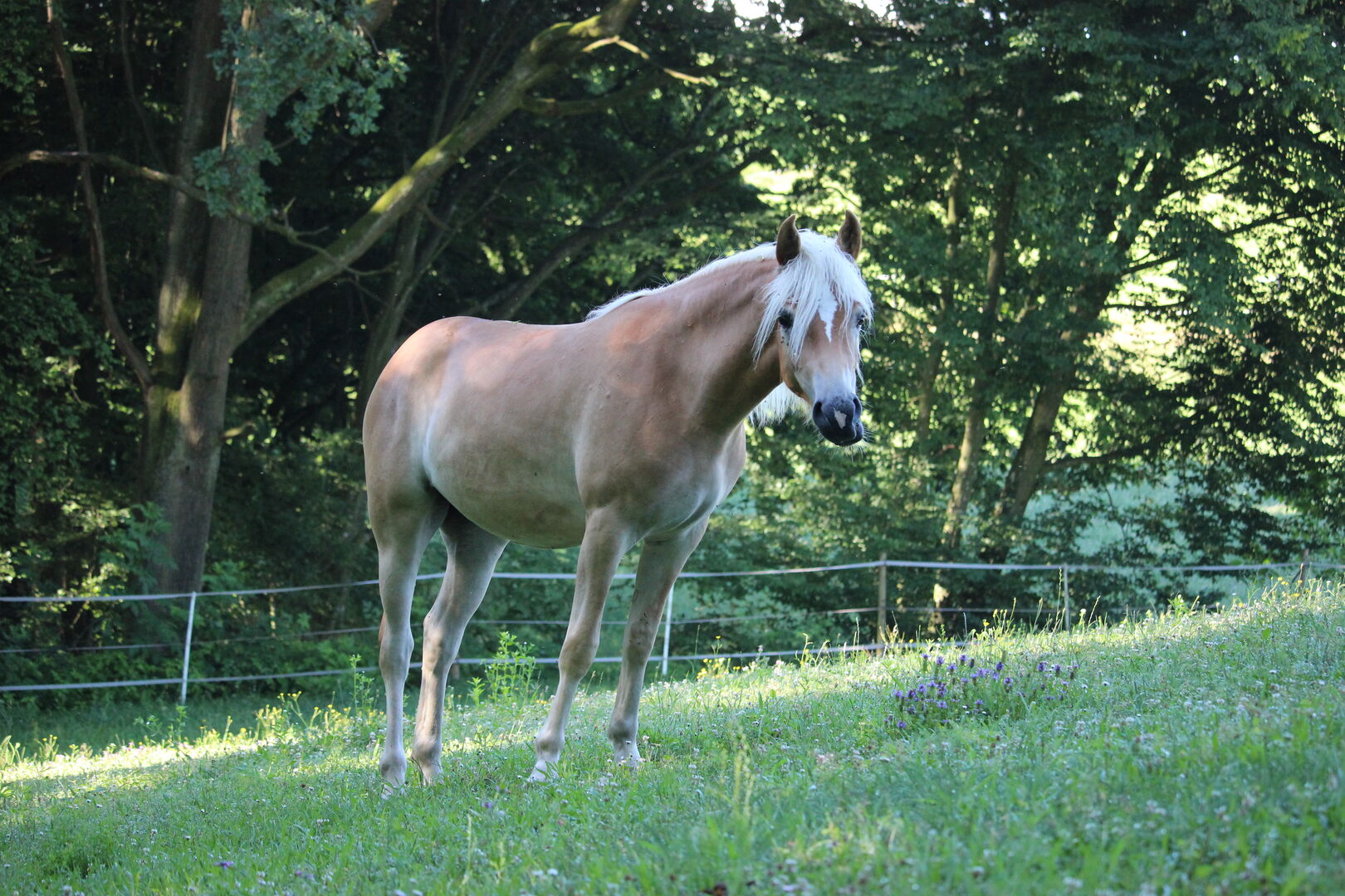 Młoda klacz rasy haflinger - Dwuletnia klacz Talina (zdjęcie po prawej) jest bardzo żywiołowa, ale ciekawska. Z pewnością jest trudniejsza w obsłudze niż Enna. Mimo to jest bardzo zorientowana na ludzi, ale szybko może stać się nieszczera. Talina zna też kilka podstaw pracy z ziemi według Parelli. W terenie jest jeszcze bardzo nerwowa i potrzebuje czasu, aż zaufa człowiekowi i uzna go za "szefa". Talina również dobrze chodzi samodzielnie. Na Czempionacie Źrebiąt osiągnęła 3 miejsce. W tej chwili ma 1,40m, ale według pomiarów gipsy powinna urosnąć do 7cm. Ojciec: Novill M: Tiara (entuzjastyczny i utalentowany skoczek) n. Cudowna