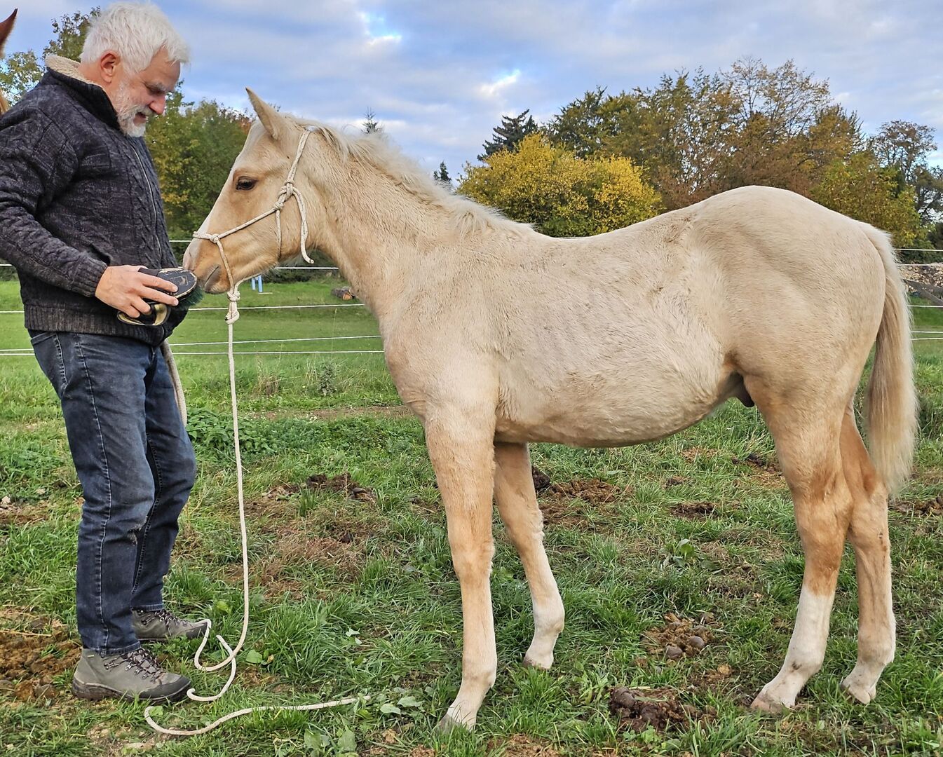 Młody talent Palomino z najlepszym rodowodem - piękny młody koń z przyszłością - Lokalizacja: 01809 Müglitztal Peppy Doc King Maxen - urodzony w 2024 r., ten palomino (ostateczny wzrost ok. 148 cm) z przepiękną białą grzywą i ogonem absolutnie przyciąga wzrok - zwarty, prawidłowo zbudowany i o obiecujących proporcjach. To młody koń, który zachwyca nie tylko wyglądem, ale i wspaniałym charakterem. Jest zorientowany na ludzi, przyjazny, uważny i chętny do nauki. Jest dobrze wychowany, zrelaksowany i nieskomplikowany w codziennym kontakcie. Z odwagą i ciekawością podejmuje wyzwania i szybko się uczy. Można go już bez problemu załadować, a w terenie jest spokojny i zrelaksowany. Ogier dorasta zdrowy i silny w otwartej stajni w mieszanym stadzie i jest z miłością i fachowością wprowadzany do swoich zadań jako koń wierzchowy - zgodnie z zasadami jeździectwa naturalnego, krok po kroku i bez presji czasu. Jego genetyka umaszczenia (e/e, A/a, CH/ch) nie tylko czyni go szczególnie interesującym pod względem umaszczenia, ale także otwiera potencjał hodowlany. Peppy jest zaszczepiony jak na swój wiek i regularnie odrobaczany. Jego rodowód nie pozostawia nic do życzenia: Najlepsze linie cięcia (wnuk Peptoboonmal) po stronie ojca spotykają się z doskonałymi cechami jeździeckimi po stronie matki - idealna kombinacja do sportu, zawodów i rekreacji. Ogier kwalifikuje się do DQHA i regionalnych czempionatów i ma wszystko, czego potrzeba, aby w przyszłości stać się wszechstronnym koniem jeździeckim z wdziękiem, talentem i sercem.