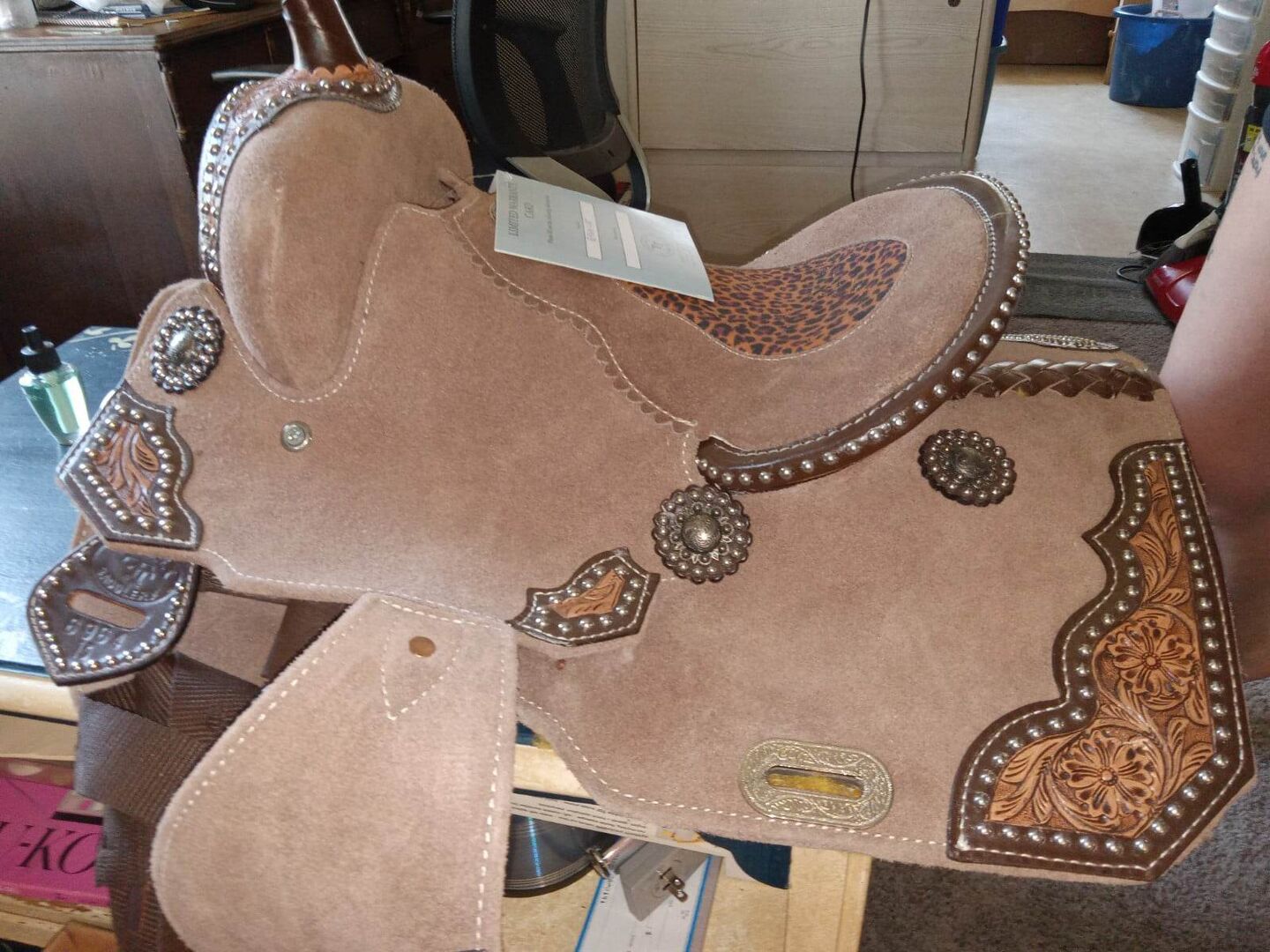 NEW WITH TAGS TAG GOT PULLED OFF NEVER BEEN USED. This Chocolate Roughout Barrel Style saddle features floral tooled accents on the skirts, fenders and pommel with a Cheetah Printed Inlay seat. This saddle is accented with silver beading throughout and features aluminum stirrups. The saddle comes equipped with front D rings, leather latigo and leather off billet.