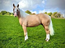 Młodzik w swojej klasie: ogier rasy Palomino Quarter Horse z perspektywami na przyszłość - Lokalizacja: 34396 Liebenau Mobsters Smart Gun - młody ogier rasy Quarter Horse w specjalnym kolorze palomino z dwoma niebieskimi oczami, urodzony 24.05.2023 r. Przyciąga wzrok swoją prawidłową, zwartą i mocną budową oraz bardzo dobrym umięśnieniem. Jego obecny wzrost to 141 cm, jego ostateczny wzrost wyniesie około 145 cm. Będzie dorastał w stadzie z ogierami i wałachami i jest zaznajomiony zarówno z otwartą stajnią, jak i pastwiskiem. Ogier jest zdrowy, przeszedł poważne badanie ogólne z 18 zdjęciami rentgenowskimi, jest 6-panelowy n/n, regularnie szczepiony i odrobaczany oraz przyzwyczajony do weterynarza i kowala. Jego charakter jest niezwykle słodki, czuły, zorientowany na ludzi i przytulny, a jednocześnie bardzo ufny, zrelaksowany i nieustraszony. Pomimo swojego spokoju jest wrażliwy, wrażliwy i delikatny w obsłudze i wcale nie wydaje się zmęczony. Regularnie się z nim obchodzimy, jest grzeczny i nieskomplikowany, zna źrebię 1×1, jest wyszkolony w pracy na halterze i bez problemu jeździ w przyczepie. Jego przyziemne chody i najwyższej klasy reiningowy rodowód (HF Mobster x Gunnatrashya) czynią z niego obiecującego młodego konia, który zachwyci zarówno na ringu pokazowym, jak i na arenie rekreacyjnej. Z jego potencjałem i złotym charakterem, ten młodzieniec jest prawdziwą obietnicą na przyszłość. Jest zarejestrowany w NRHA i posiada ubezpieczenie na życie (w tym na wypadek trwałej niezdolności do pracy), które w razie potrzeby można wykupić.