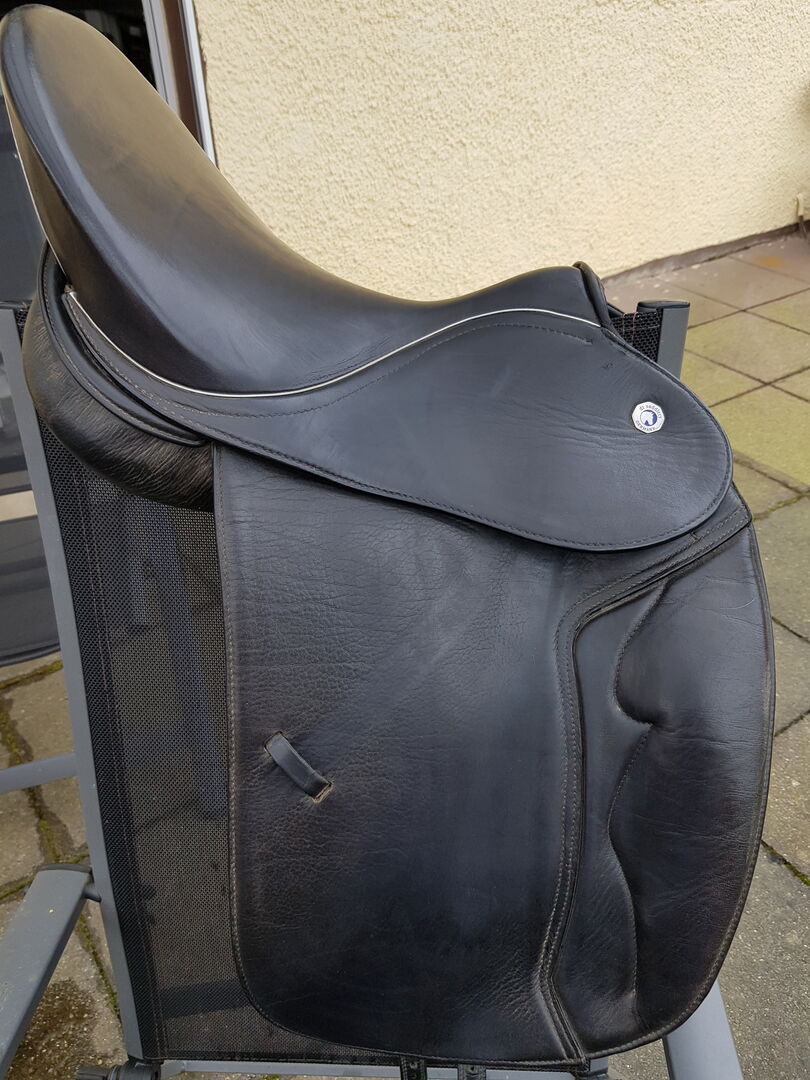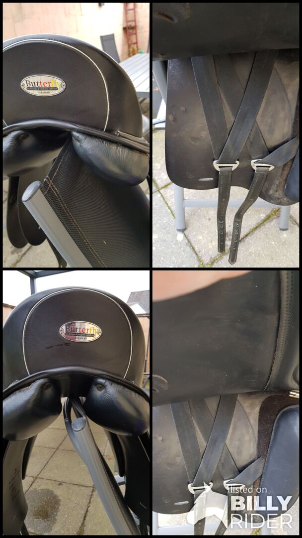 Motyl Claudia 17 Zoll - Siodło ujeżdżeniowe Butterfly Claudia 17 cali. Idealne dla koni z krótkim siodłem. Siodło jest sprzedawane tylko z powodu nowego zakupu. Używano go na niemieckim kucyku do jazdy konnej o bardzo krótkiej powierzchni styku. Jest w dobrym stanie z niewielkimi śladami użytkowania.