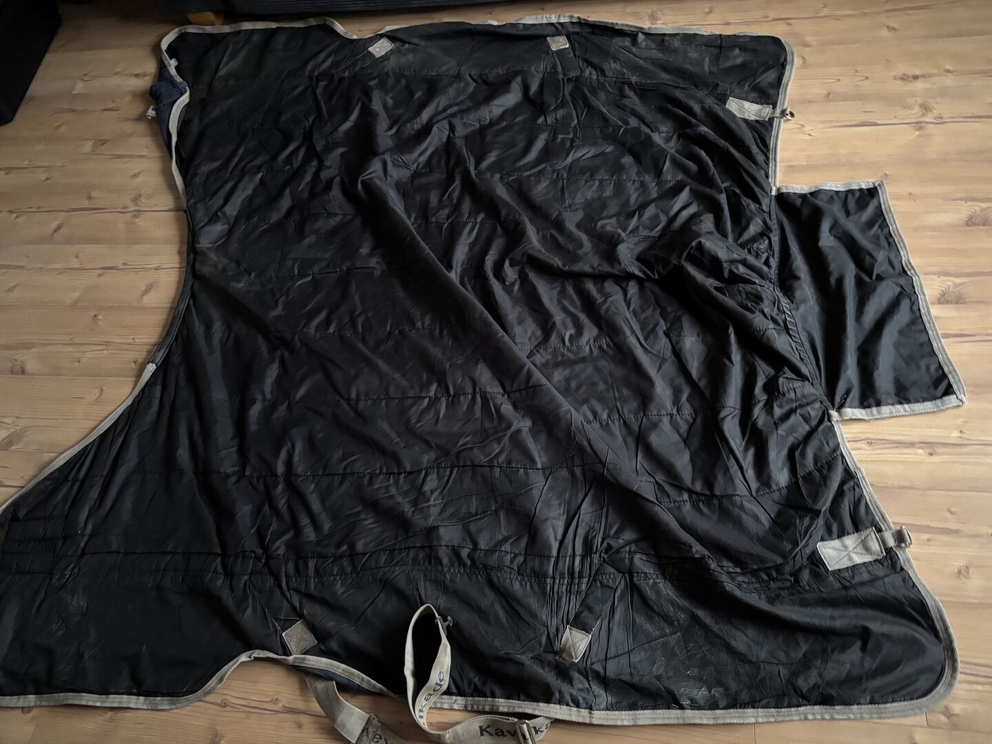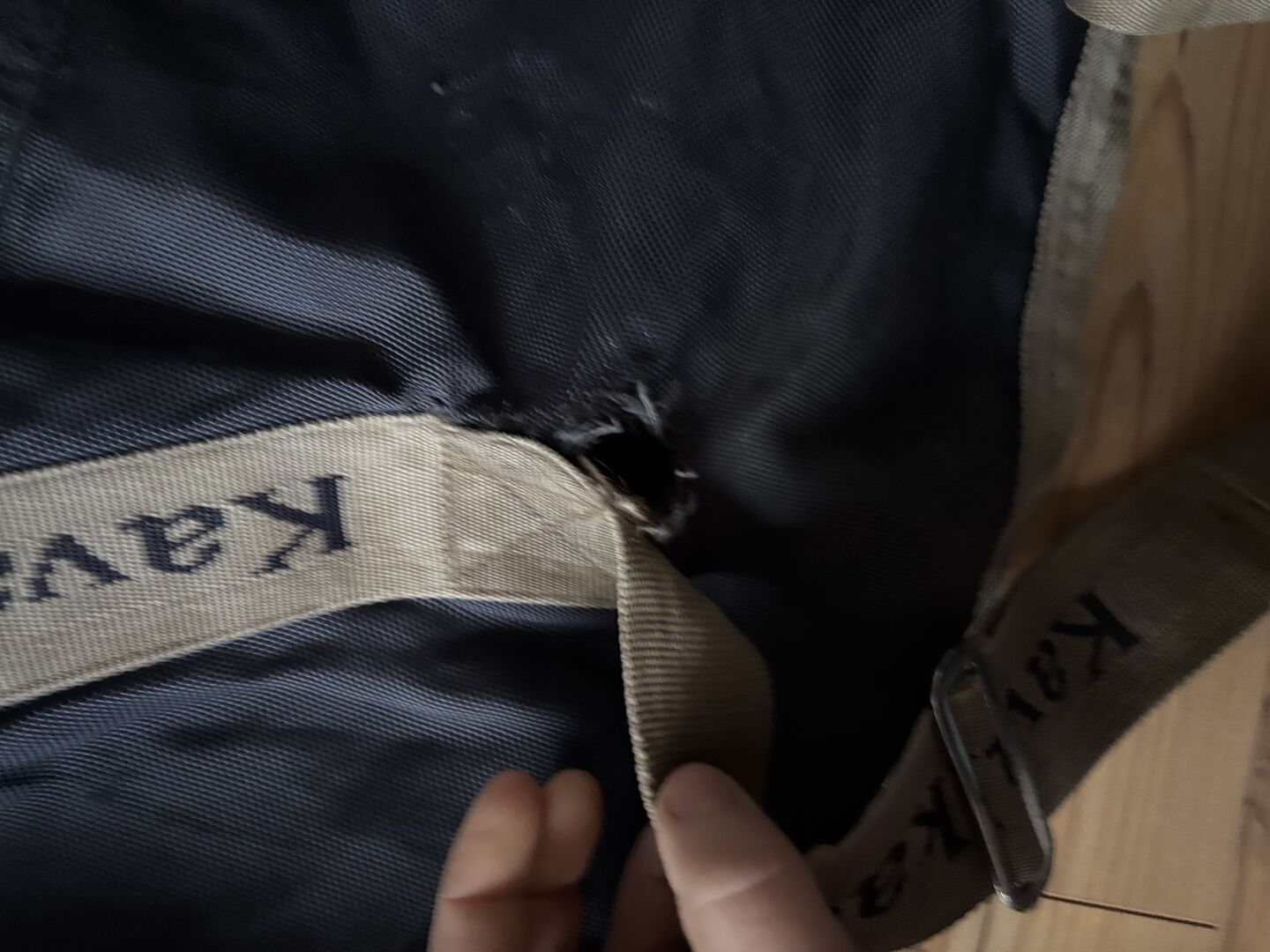 Na sprzedaż Kavalkade 100g 145 cm - Sprzedam używany koc przeciwdeszczowy, ma 2 dziury patrz zdjęcia, ale ma 1850 dn odporności na rozdarcie, ponieważ nie pasuje do mojego kucyka, sprzedaję go.