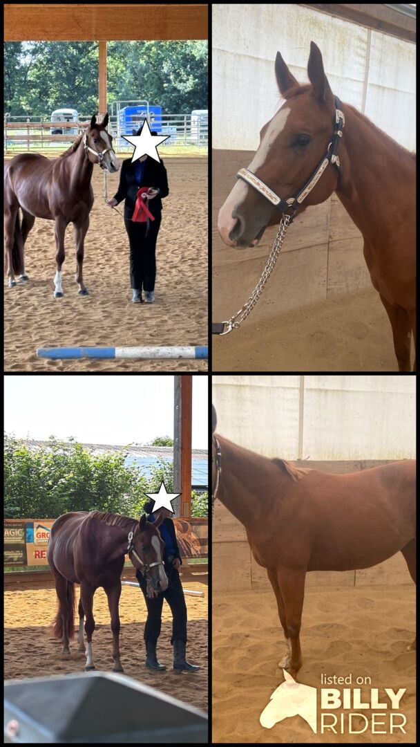 Najlepsza młoda klacz QH po wszechstronnym reproduktorze Unxpected - Lokalizacja: 92665 Kirchendemenreuth JRS Unxpected Sorrel - ta piękna klacz rasy Quarter Horse, urodzona 19.05.2021 r., w kolorze szczawiu z nakrapianą sierścią, jest sprzedawana z pełnymi dokumentami AQHA i paszportem konia. Przy obecnym wzroście ok. 150 cm jest jeszcze w pełni wzrostu. Prawidłowo zbudowana, dobrze rozwinięta i zrównoważona muskulatura, wykazuje doskonały rozwój. 5-panelowy n/n. Zdjęcia rentgenowskie są dostępne. Dzięki swojemu pierwszorzędnemu wszechstronnemu rodowodowi zapowiada się na najlepszego wszechstronnego prospekta. Fiona była profesjonalnie jeżdżona przez Annę Gürlich przez 3 miesiące i jest już bardzo zaawansowana jak na swój wiek. Jest świetna pod siodłem, chętna do nauki, uważna i utalentowana. Potrafi naprawdę dobrze się ruszać. Jest również bardzo grzeczna w terenie. Klacz została pokazana po raz pierwszy na zawodach i pokazała się z najlepszej strony. Feona jest po prostu bardzo słodkim młodym koniem, ciekawskim, nieustraszonym i przytulnym. Każdy, kto szuka utalentowanego młodego konia do pokazów i rekreacji, powinien się jej przyjrzeć. Jest sprzedawana przez hodowcę z powodu redukcji stada. Obecnie jest dosiadana przez młodzieńca.