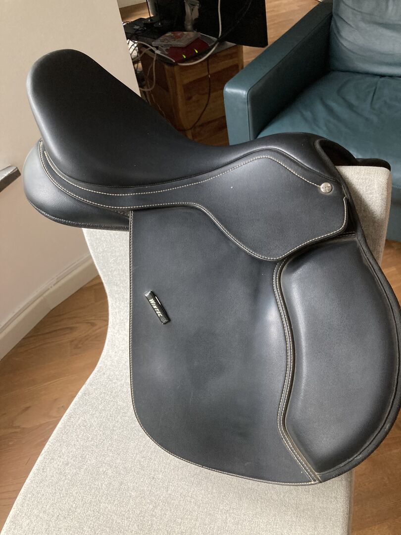 Najwyższy stan siodła skokowego Wintec 500 - Sprzedaję moje używane, ale w najlepszym stanie siodło skokowe Wintec. - Model Wintec 500 Jump - 17.0 cala - Z Cair - Obecnie czarna płyta wpustowa, którą można łatwo wymienić dzięki systemowi EasyChange - Indywidualnie regulowane rolki kolanowe