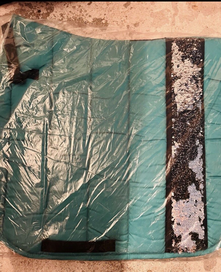 Nakładka na siodło z cekinami - Sprzedam nową podkładkę pod siodło z cekinami. Cekiny można obracać. Ujeżdżeniowy koń parokonny. Możliwa wysyłka i Paypal