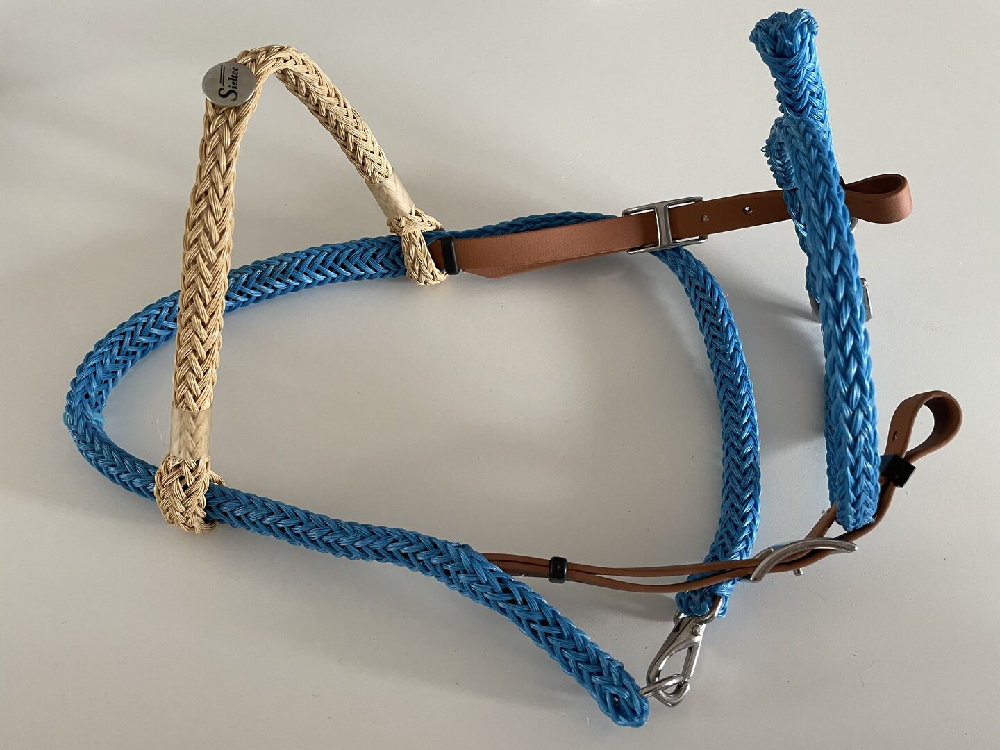 Kolory uzdy to beżowy, Biothane w kolorze brązowym i Seaplast niebieski.