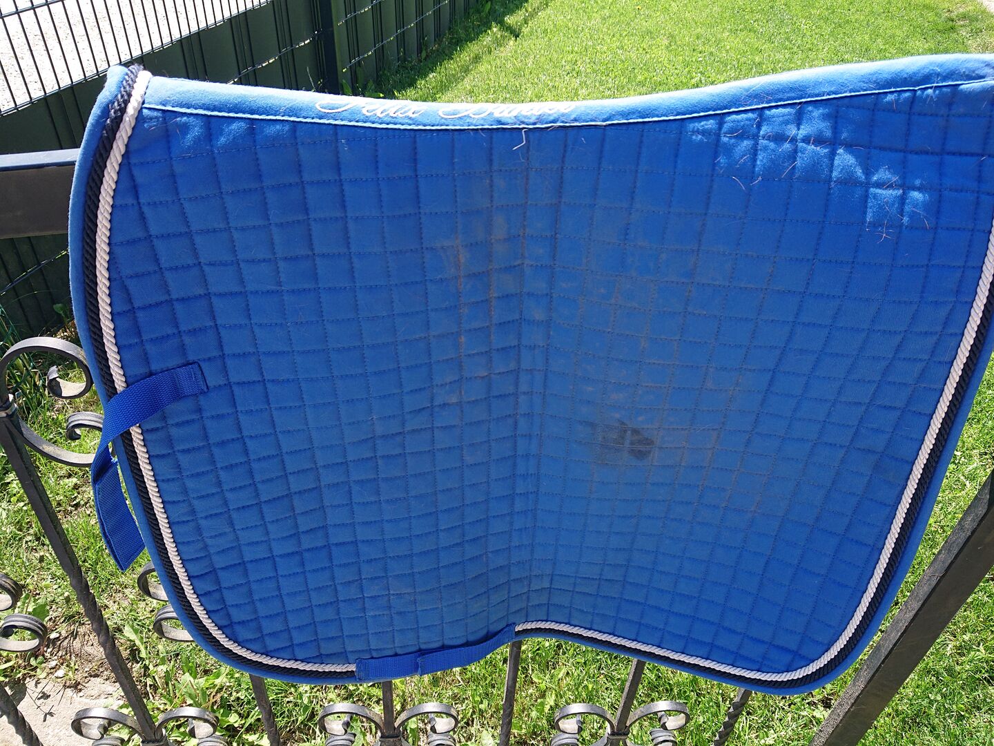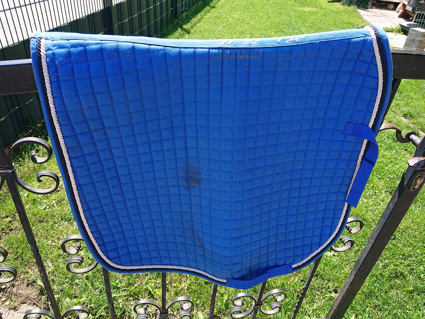 Nakładki na siodła, rozmiar Dressage Full, HKM i Felix Brühler - Używane podkładki pod siodła, świeżo wyprane, niebieska Felix Brühler ma niestety plamy, ale może wyjdą przy następnym praniu, poza tym stan dobry, gotowe do kolejnej rundy! Pojedynczo, 10€ za ściereczkę do siodła, 5€ Felix