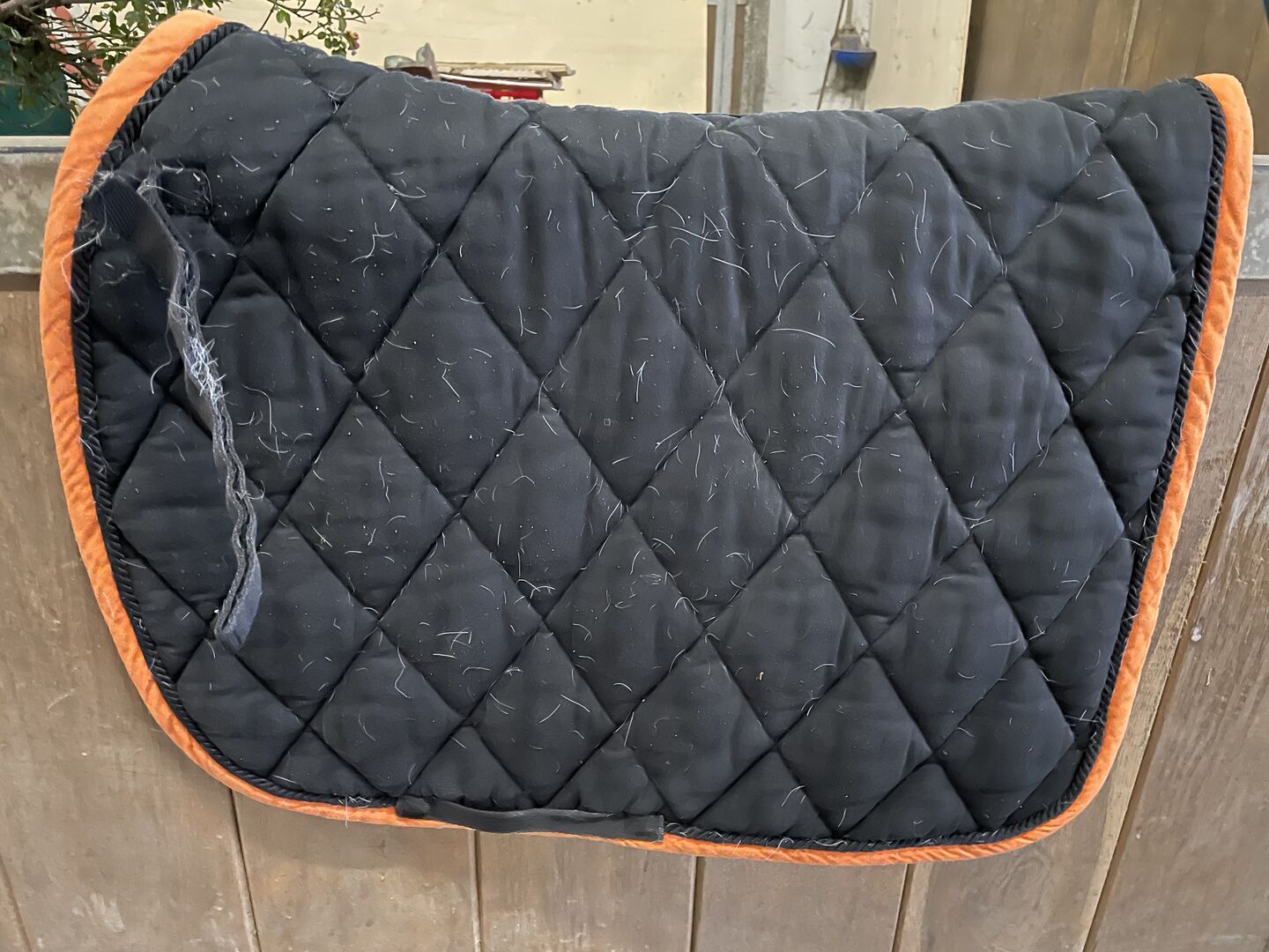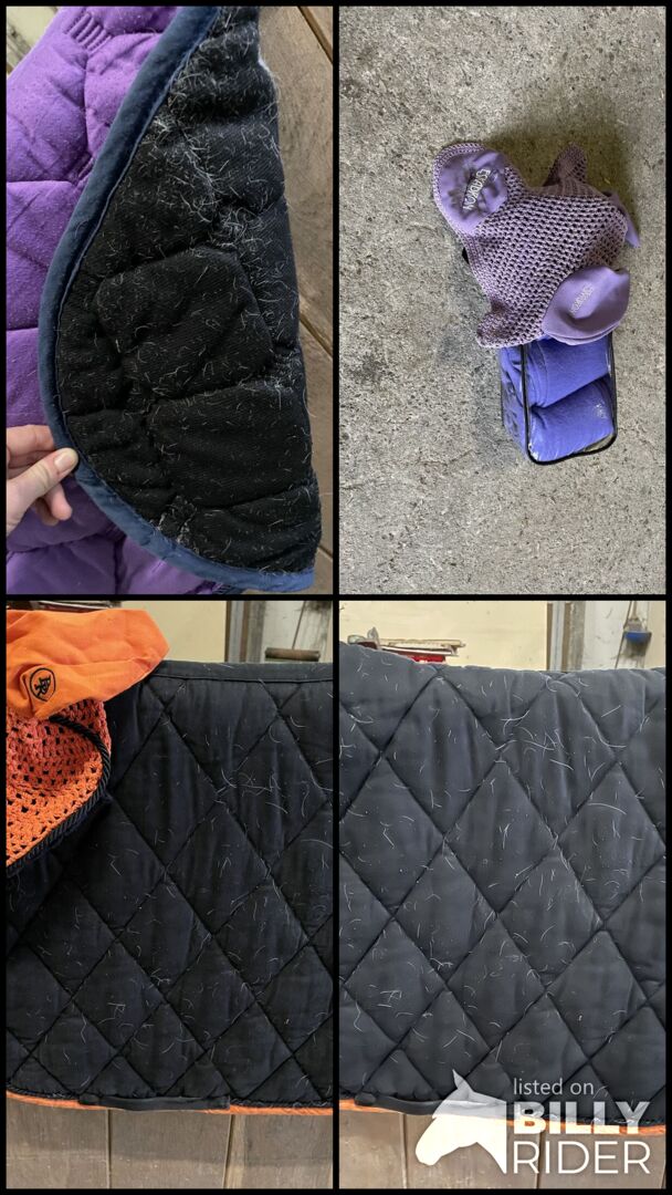 Nakładki na siodło również w komplecie - Podkładka pod siodło VS w kolorze fioletowym z granatowym sznurkiem i obwódką. Rozmiar wb. Podkładka pod siodło była na siwym koniu, nie wszystkie włosy zniknęły. Koc jest wyprany. Fioletowa maska na muchy może być sprzedawana oddzielnie lub w komplecie z podkładką pod siodło. Kolejna propozycja podkładki pod siodło ujeżdżeniowe w kolorze czarnym z czarnym sznurkiem i pomarańczową obwódką. Rozmiar wb. Podkładka pod siodło była na siwym koniu, nie wszystkie włosy zniknęły. Koc jest wyprany. Można również sprzedać pasujący kapturek na ucho i 2 bandaże. W zestawie za 15€, podkładka pod siodło osobno za 5€.