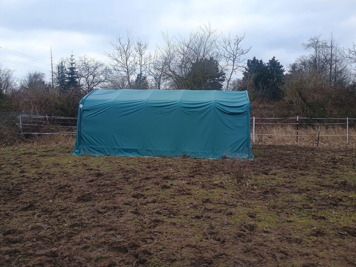 Namiot pastwiskowy 3,30 m x 6 m z zestawem sztormowym - Sprzedajemy nasz namiot pastwiskowy, ponieważ już go nie potrzebujemy. Ma zaledwie 6 miesięcy i naprawdę ma tylko minimalne ślady użytkowania - ogólnie bardzo dobry stan.